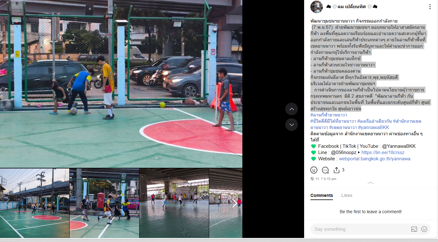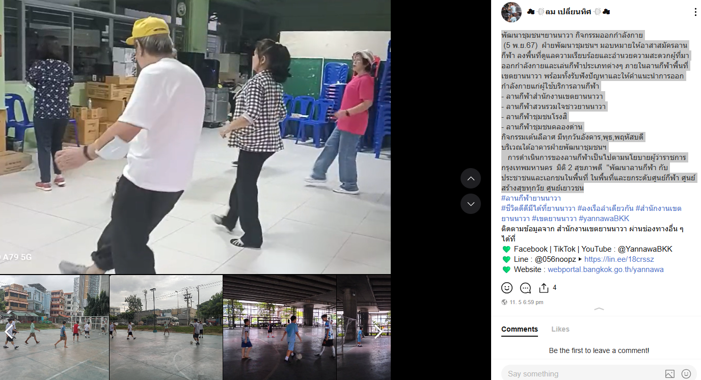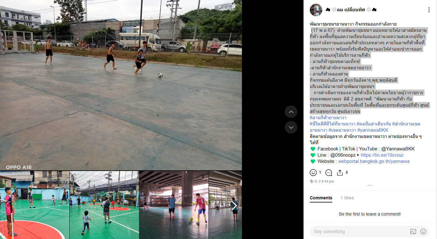 ![]() | 06-04-2025 | 0.00 | ![]() | พัฒนาชุมชนฯยานนาวา กิจกรรมออกกำลังกาย (29 มี.ค.68) ฝ่ายพัฒนาชุมชนฯ มอบหมายให้อาสาสมัครลานกีฬา ลงพื้นที่ดูแลความเรียบร้อยและอำนวยความสะดวกผู้ที่มาออกกำลังกายและเล่นกีฬาประเภทต่างๆ ภายในลานกีฬาพื้นที่เขตยานนาวา พร้อมทั้งรับฟังปัญหาและให้คำแนะนำการออกกำลังกายแก่ผู้ใช้บริการลานกีฬา - ลานกีฬาชุมชนวัดช่องลม - ลานกีฬาชุมชนคลองด่าน - ลานกีฬาสวนรวมใจชาวยานนาวา จำนวนผู้ใช้บริการลานกีฬา 114 คน กิจกรรมเต้นลีลาศ มีทุกวันอังคาร,พุธ,พฤหัสบดี บริเวณใต้อาคารฝ่ายพัฒนาชุมชนฯ การดำเนินการของลานกีฬาเป็นไปตามนโยบายผู้ว่าราชการกรุงเทพมหานคร มิติ 2 สุขภาพดี "พัฒนาลานกีฬา กับประชาชนและเอกชนในพื้นที่ ในพื้นที่และยกระดับศูนย์กีฬา ศูนย์สร้างสุขทุกวัย ศูนย์เยาวชน #ลานกีฬายานนาวา #ชีวิตดีดีมีได้ที่ยานนาวา #ลงเรือลำเดียวกัน #สำนักงานเขตยานนาวา |