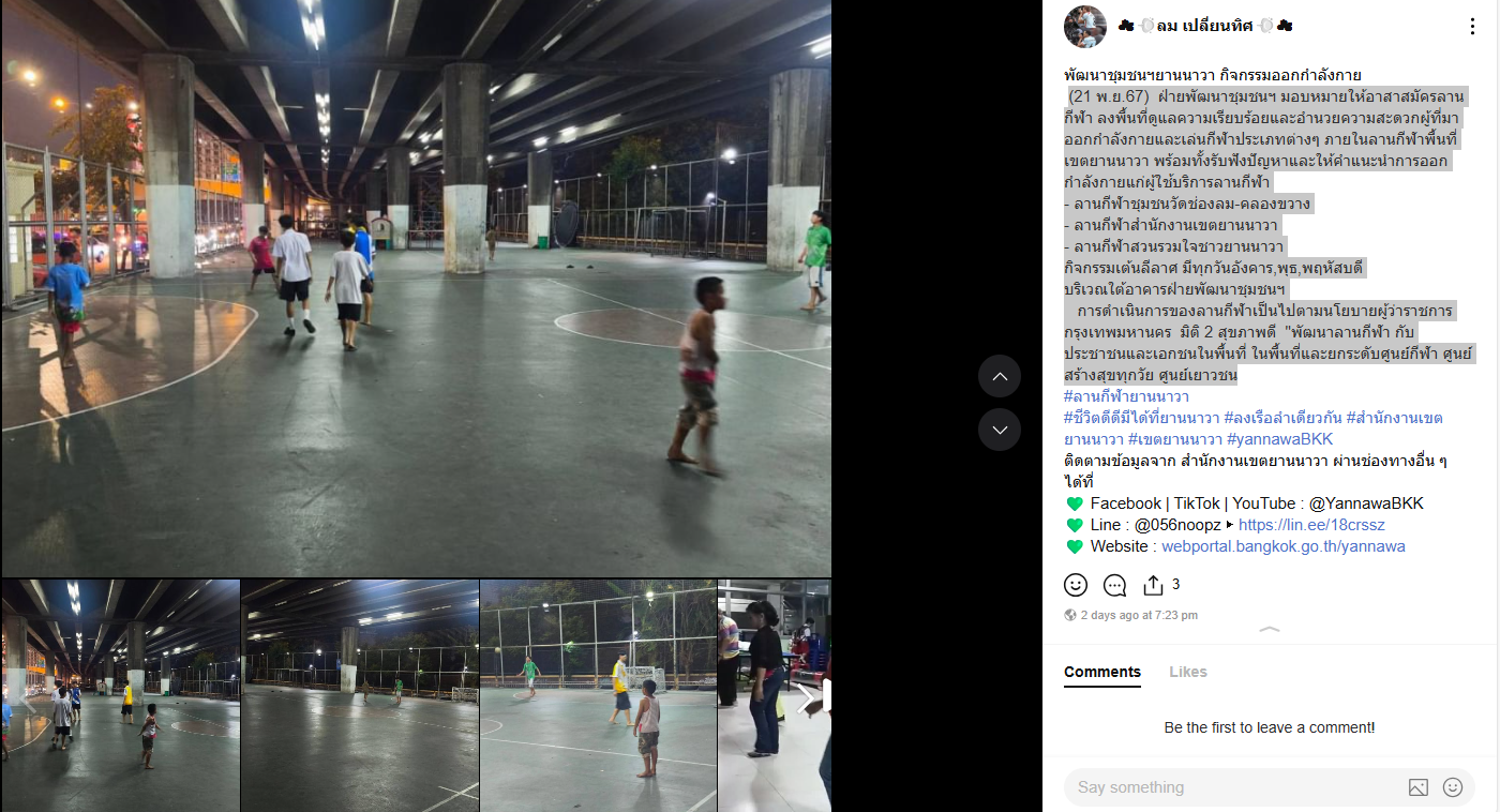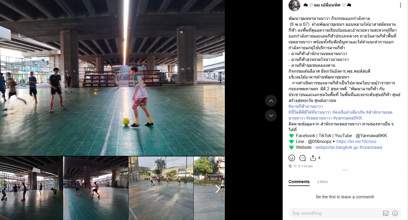 ![]() | 23-11-2024 | 0.00 | ![]() | (21 พ.ย.67) ฝ่ายพัฒนาชุมชนฯ มอบหมายให้อาสาสมัครลานกีฬา ลงพื้นที่ดูแลความเรียบร้อยและอำนวยความสะดวกผู้ที่มาออกกำลังกายและเล่นกีฬาประเภทต่างๆ ภายในลานกีฬาพื้นที่เขตยานนาวา พร้อมทั้งรับฟังปัญหาและให้คำแนะนำการออกกำลังกายแก่ผู้ใช้บริการลานกีฬา - ลานกีฬาชุมชนวัดช่องลม-คลองขวาง - ลานกีฬาสำนักงานเขตยานนาวา - ลานกีฬาสวนรวมใจชาวยานนาวา กิจกรรมเต้นลีลาศ มีทุกวันอังคาร,พุธ,พฤหัสบดี บริเวณใต้อาคารฝ่ายพัฒนาชุมชนฯ การดำเนินการของลานกีฬาเป็นไปตามนโยบายผู้ว่าราชการกรุงเทพมหานคร มิติ 2 สุขภาพดี "พัฒนาลานกีฬา กับประชาชนและเอกชนในพื้นที่ ในพื้นที่และยกระดับศูนย์กีฬา ศูนย์สร้างสุขทุกวัย ศูนย์เยาวชน | |