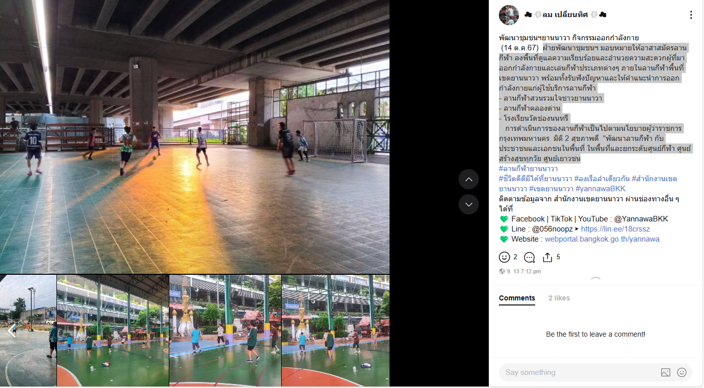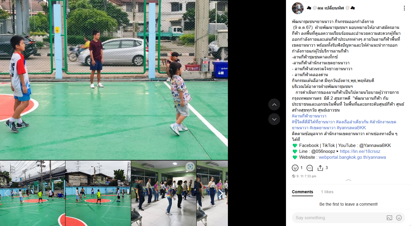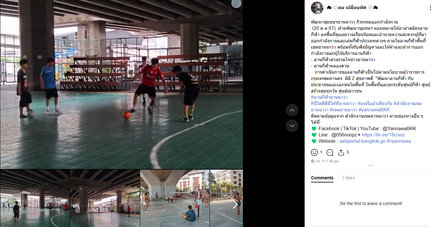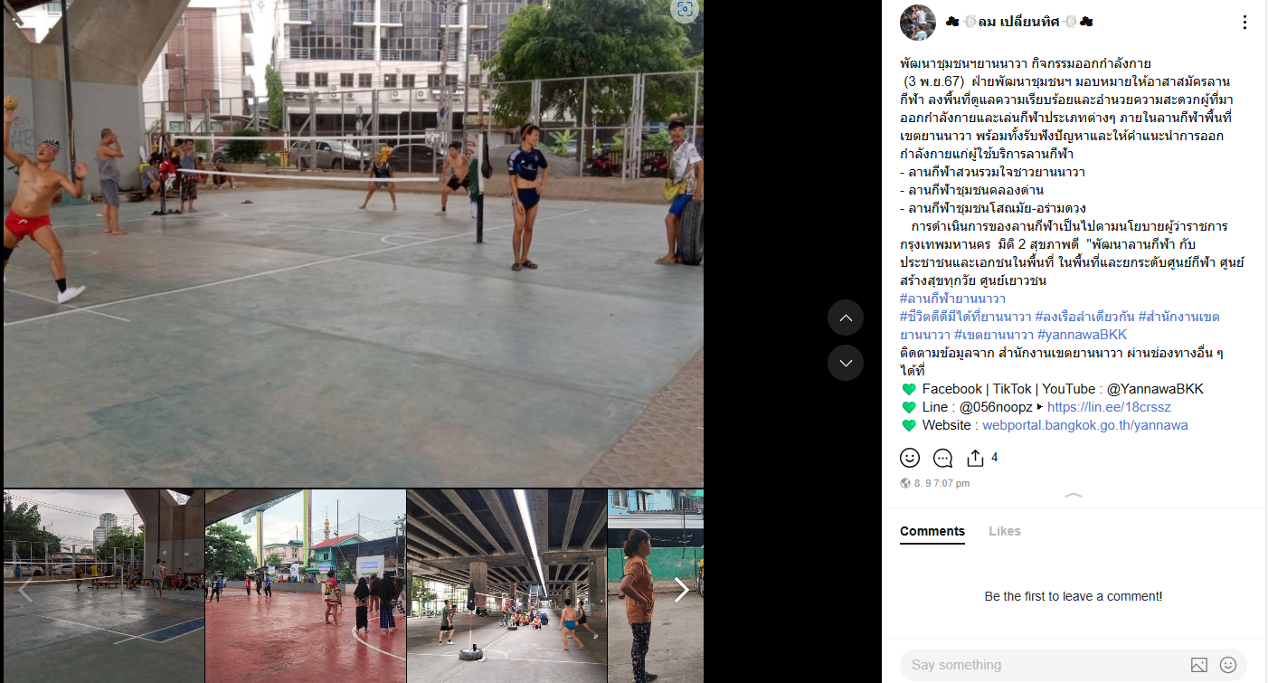 ![]() | 05-11-2024 | 0.00 | ![]() | วันที่ 2 พฤศจิกายน 2567 ฝ่ายพัฒนาชุมชนฯ มอบหมายให้อาสาสมัครลานกีฬา ลงพื้นที่ดูแลความเรียบร้อยและอำนวยความสะดวกผู้ที่มาออกกำลังกายและเล่นกีฬาประเภทต่างๆ ภายในลานกีฬาพื้นที่เขตยานนาวา พร้อมทั้งรับฟังปัญหาและให้คำแนะนำการออกกำลังกายแก่ผู้ใช้บริการลานกีฬา - ลานกีฬาสวนรวมใจชาวยานนาวา - ลานกีฬาชุมชนคลองด่าน - ลานกีฬาชุมชนโสณมัย-อร่ามดวง การดำเนินการของลานกีฬาเป็นไปตามนโยบายผู้ว่าราชการกรุงเทพมหานคร มิติ 2 สุขภาพดี "พัฒนาลานกีฬา กับประชาชนและเอกชนในพื้นที่ ในพื้นที่และยกระดับศูนย์กีฬา ศูนย์สร้างสุขทุกวัย ศูนย์เยาวชน | |