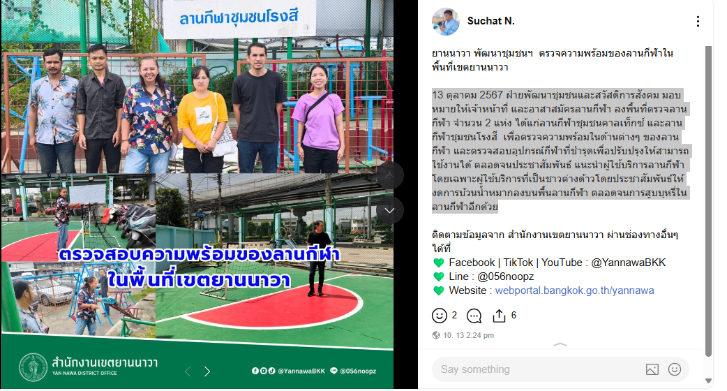 ![]() | 29-10-2024 | 0.00 | ![]() | วันที่ 13 ตุลาคม 2567 ฝ่ายพัฒนาชุมชนและสวัสดิการสังคม มอบหมายให้เจ้าหน้าที่ และอาสาสมัครลานกีฬา ลงพื้นที่ตรวจลานกีฬา จำนวน 2 แห่ง ได้แก่ลานกีฬาชุมชนคาลเท็กซ์ และลานกีฬาชุมชนโรงสี เพื่อตรวจความพร้อมในด้านต่างๆ ของลานกีฬา และตรวจสอบอุปกรณ์กีฬาที่ชำรุดเพื่อปรับปรุงให้สามารถใช้งานได้ ตลอดจนประชาสัมพันธ์ แนะนำผู้ใช้บริการลานกีฬา โดยเฉพาะผู้ใช้บริการที่เป็นชาวต่างด้าวโดยประชาสัมพันธ์ให้งดการบ้วนน้ำหมากลงบนพื้นลานกีฬา ตลอดจนการสูบบุหรี่ในลานกีฬาอีกด้วย | |