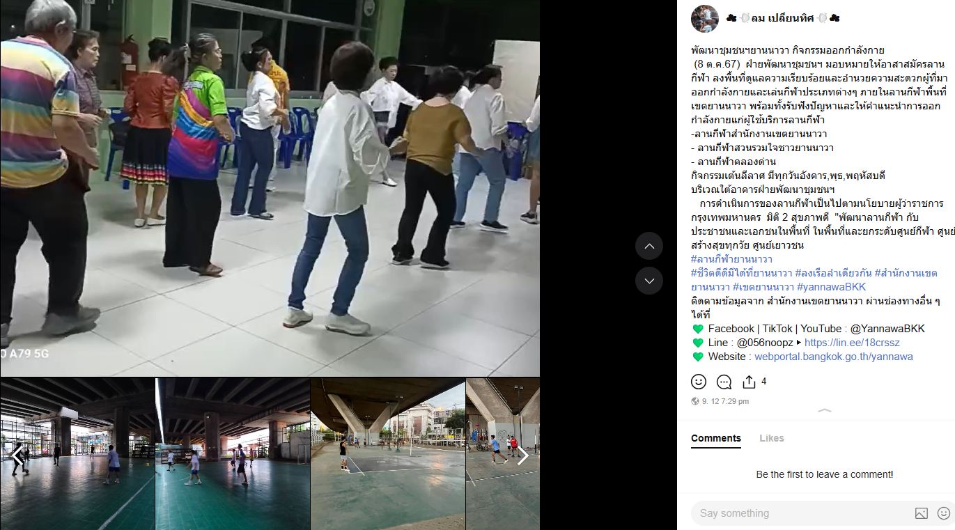 ![]() | 21-05-2025 | 0.00 | ![]() | พัฒาชุมชนฯยานนาวา กิจกรรมออกกำลังกาย (11 พ.ค.68) ฝ่ายพัฒนาชุมชนฯ มอบหมายให้อาสาสมัครลานกีฬา ลงพื้นที่ดูแลความเรียบร้อยและอำนวยความสะดวกผู้ที่มาออกกำลังกายและเล่นกีฬาประเภทต่างๆ ภายในลานกีฬาพื้นที่เขตยานนาวา พร้อมทั้งรับฟังปัญหาและให้คำแนะนำการออกกำลังกายแก่ผู้ใช้บริการลานกีฬา - ลานกีฬาชุมชนโสณมัย-อร่ามดวง - ลานกีฬาชุมชนวัดช่องลม-คลองขวาง - ลานกีฬาชุมชนคลองด่าน จำนวนผู้ใช้บริการลานกีฬา 3 ลาน ทั้งหมด 104 คน กิจกรรมเต้นลีลาศ มีทุกวันอังคาร,พุธ,พฤหัสบดี บริเวณใต้อาคารฝ่ายพัฒนาชุมชนฯ การดำเนินการของลานกีฬาเป็นไปตามนโยบายผู้ว่าราชการกรุงเทพมหานคร มิติ 2 สุขภาพดี "พัฒนาลานกีฬา กับประชาชนและเอกชนในพื้นที่ ในพื้นที่และยกระดับศูนย์กีฬา ศูนย์สร้างสุขทุกวัย ศูนย์เยาวชน | |
