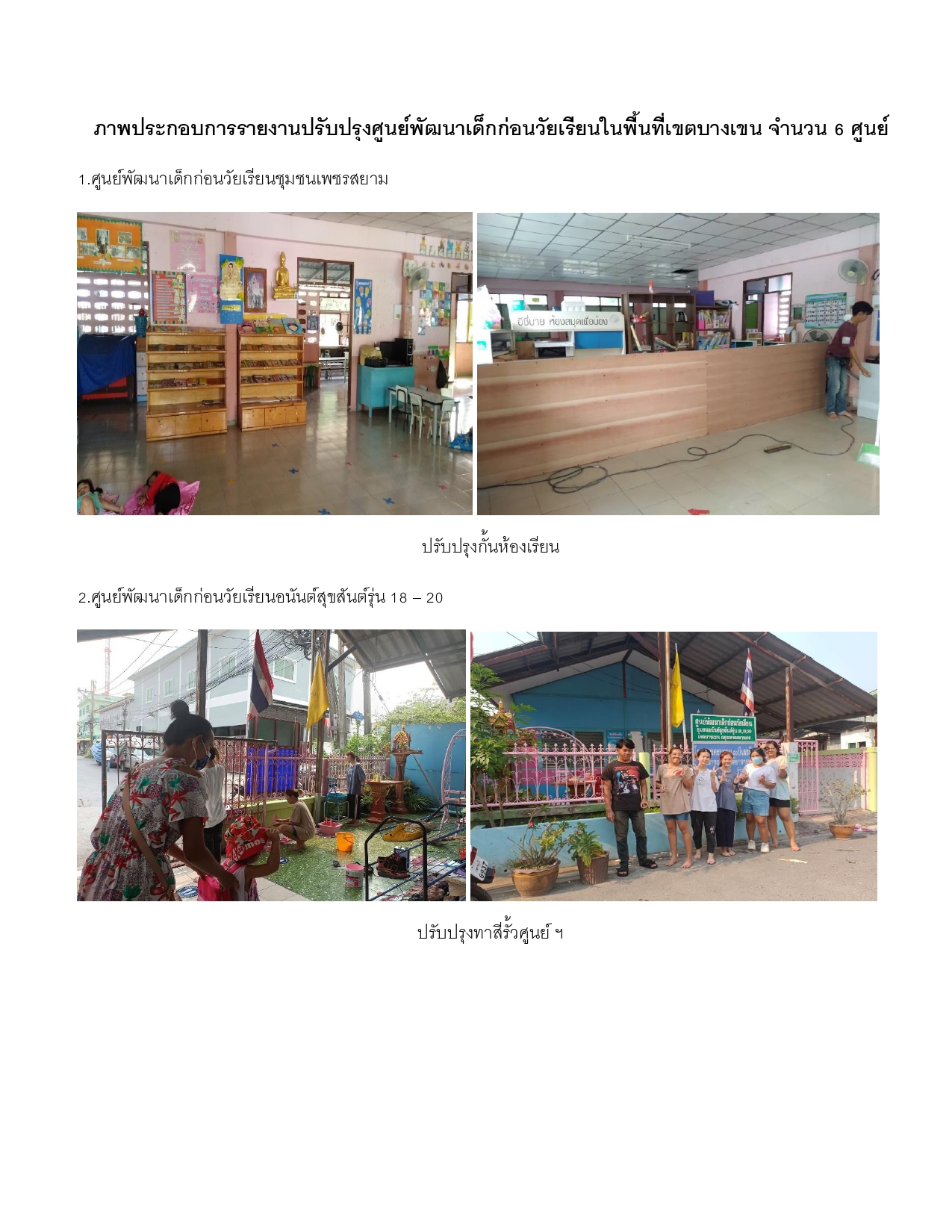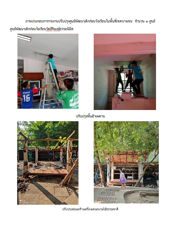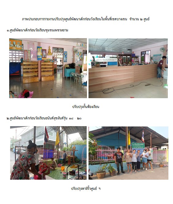 24-11-20232.00ดำเนินการปรับปรุงศูนย์พัฒนาเด็กก่อนวัยเรียนในพื้นที่เขตบางเขน จำนวน 2 ศูนย์ ประกอบด้วย 1.ศูนย์พัฒนาเด็กก่อนวัยเรียนชุมชนเพชรสยาม ปรับปรุงกั้นห้องเรียน 2.ศูนย์พัฒนาเด็กก่อนวัยเรียนอนันต์สุขสันต์รุ่น 18 – 20 ปรับปรุงทาสีรั้วศูนย์ ฯ เรียบร้อยแล้ว