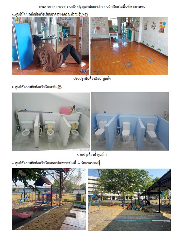 05-03-20243.00ปรับปรุงศูนย์พัฒนาเด็กก่อนวัยเรียนในพื้นที่เขตบางเขน จำนวน 3 ศูนย์ เรียบร้อยแล้ว ได้แก่ 1.ศูนย์เด็กฯอาคารสงเคราะห์รามอินทรา ปรับปรุงพื้นห้องเรียน 2.ศูนย์ด็กฯเจริญศิริ ปรับปรุงห้องน้ำ 3.ศูนย์เด็กฯกองพันทหารช่างที่ 1 รักษาพระองค์ ปรับปรุงสนามเด็กเล่น