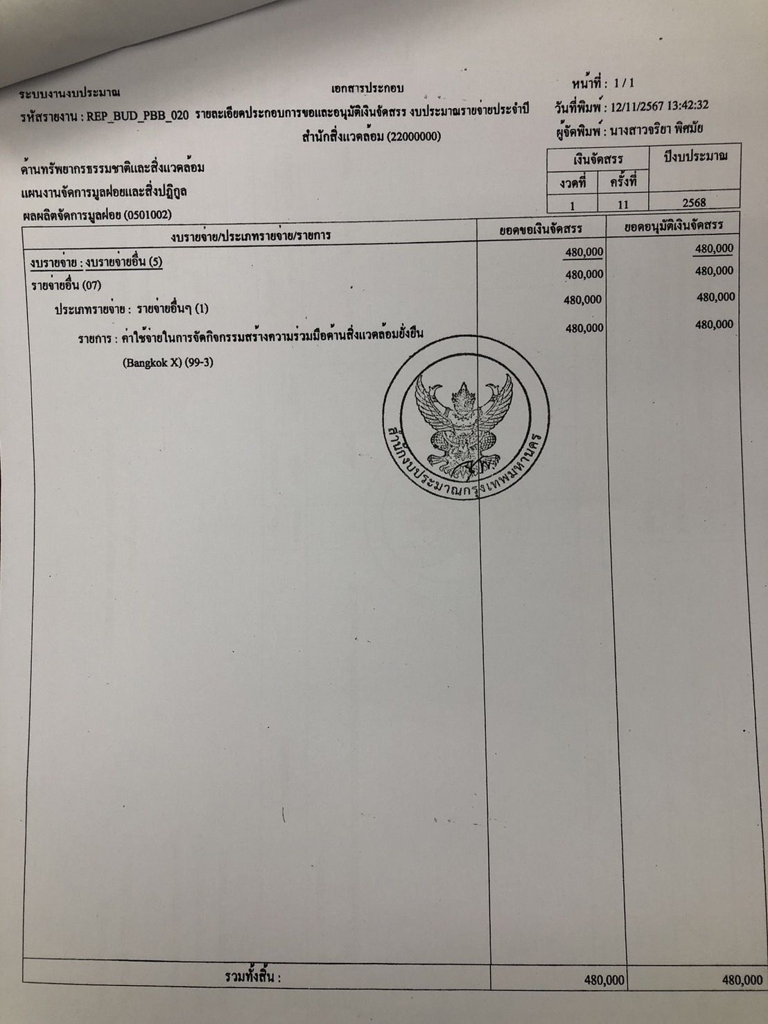 ![]() | ค่าใช้จ่ายในการจัดกิจกรรมสร้างความร่วมมือด้านสิ่งแวดล้อมยั่งยืน (Bangkok X) | 480,000.00 | 100.00 | สำนักสิ่งแวดล้อม | กองนโยบายและแผนงาน |