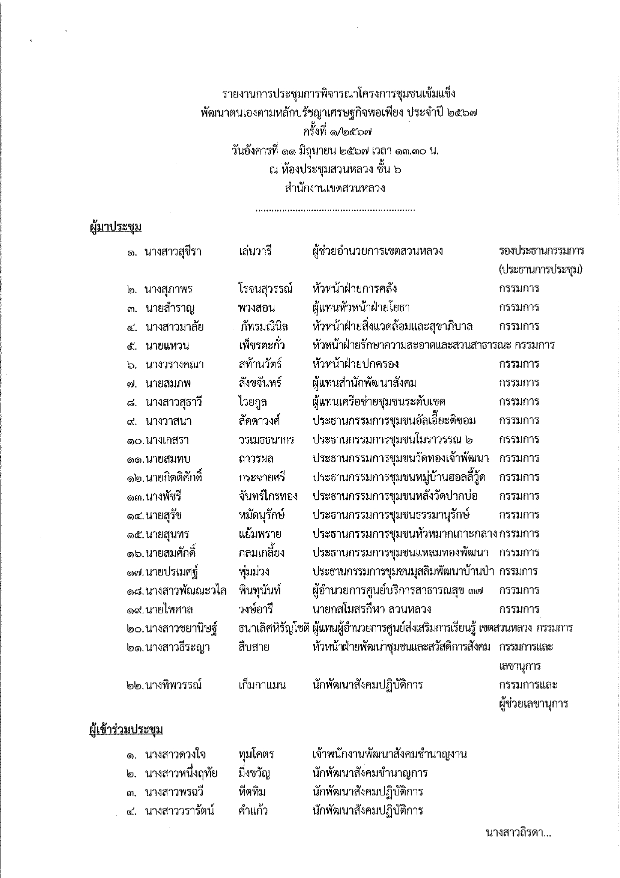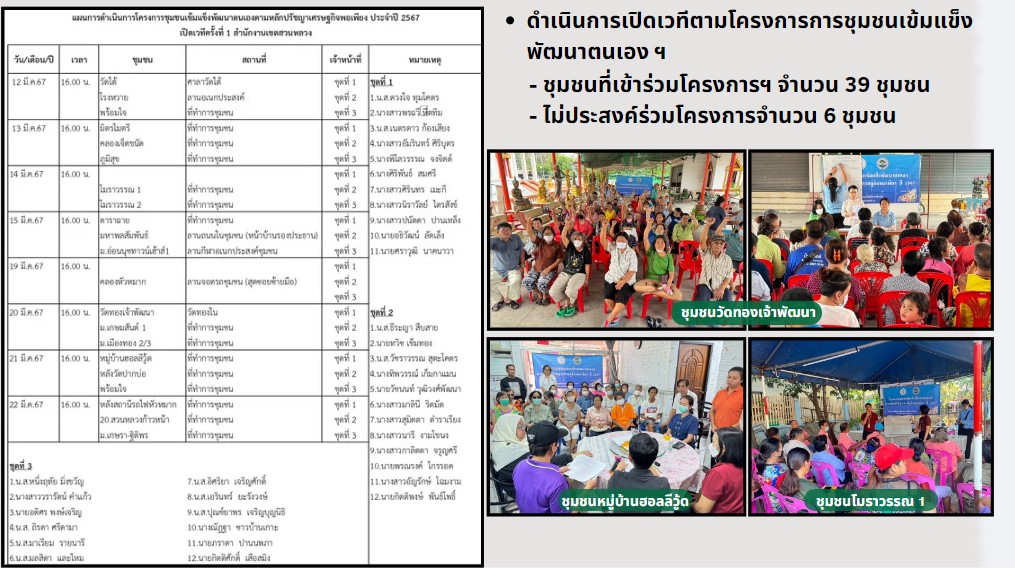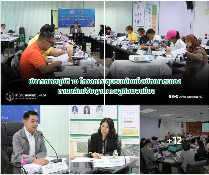 | 09-08-2024 | 0.00 |  | 11 กรกฎาคม 2567 ประชุมพิจารณา โครงการชุมชนเข้มแข็งพัฒนาตนเอง ตามหลักปรัชญาเศรษฐกิจพอเพียง ประจำปี 2567 ครั้งที่ 2/2567 เพื่อพิจารณาชุมชนที่มีการเปลี่ยนแปลงโครงการ จำนวน 9 ชุมชน 10 โครงการ ซึ่งในที่ประชุมไม่ได้มีการแก้ไข และให้ผ่านทั้ง 10 โครงการ