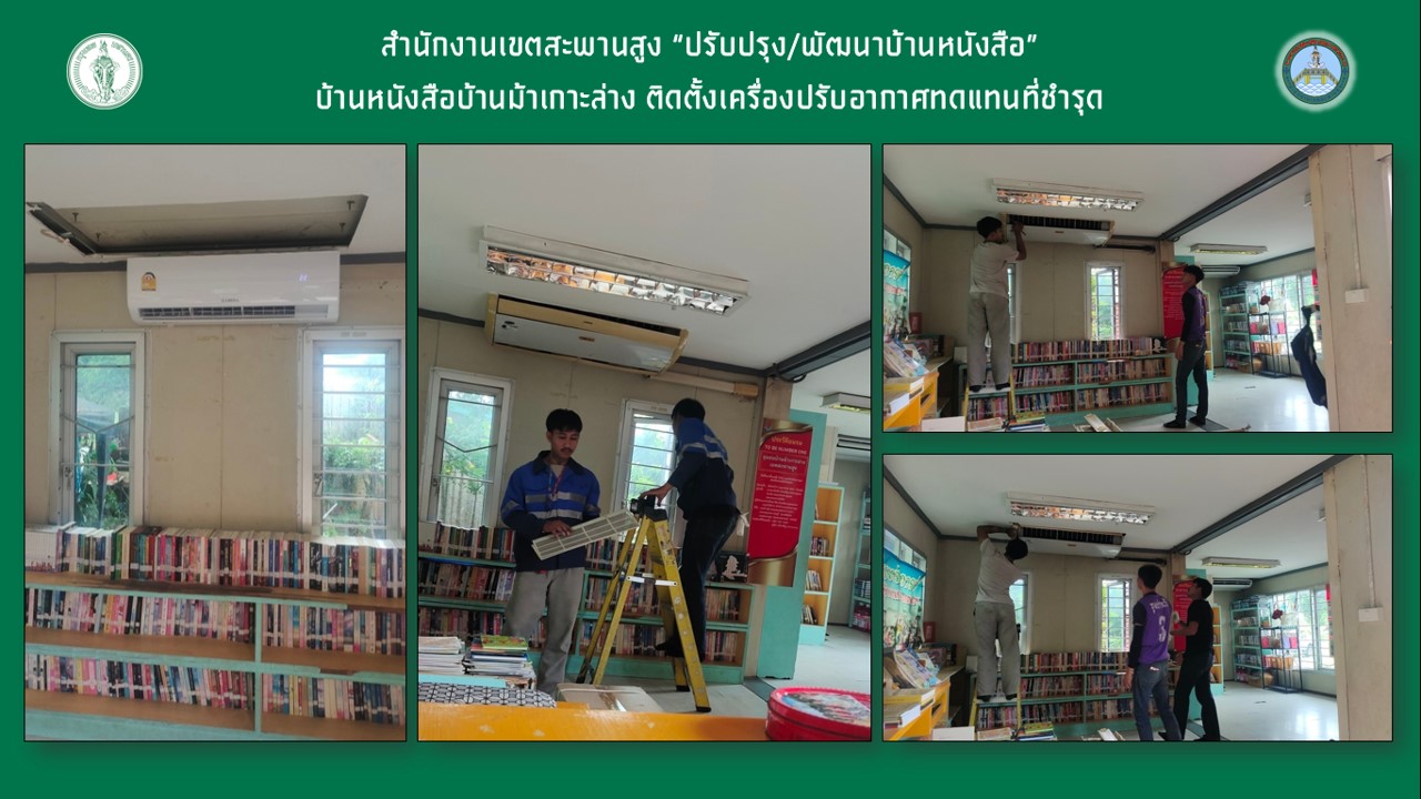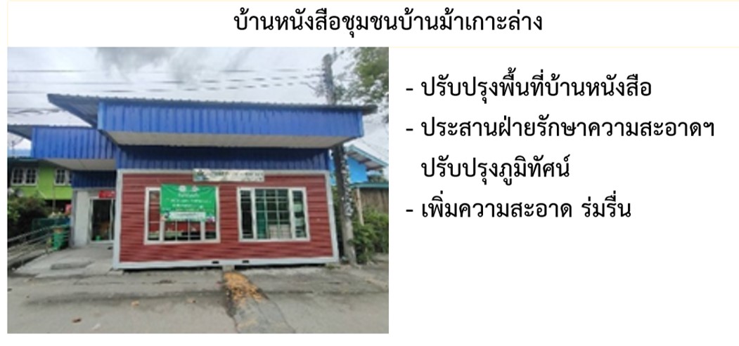 28-03-20240.00บ้านหนังสือ ชุมชนบ้านหนังสือบ้านม้าเกาะล่าง - ปรับปรุงภูมิทัศน์ภายนอกอาคาร โดยการตัดแต่งกิ่งไม้ที่คลุมบริเวณรอบบ้านหนังสือ และตัดหญ้ารอบบ้านหนังสือ - อยู่ระหว่างจัดซื้อแอร์ทดแทนเครื่องที่จำหน่าย - อยู่ระหว่างเสนอของบประมาณซ่อมพื้น ประตู หน้าต่าง และห้องน้ำ