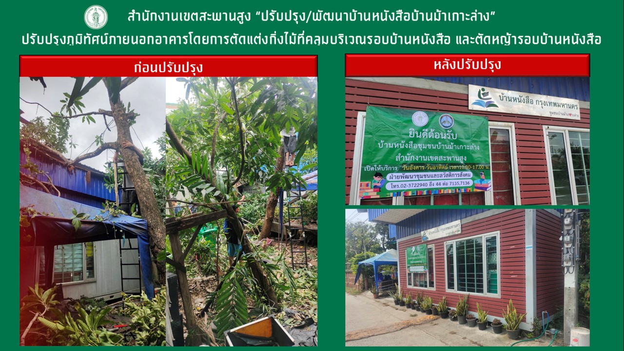 10-04-20241.00บ้านหนังสือชุมชนบ้านหนังสือบ้านม้าเกาะล่าง ปรับปรุงภูมิทัศน์ภายนอกอาคารโดยการตัดแต่งกิ่งไม้ที่คลุมบริเวณรอบบ้านหนังสือ และตัดหญ้ารอบบ้านหนังสือ