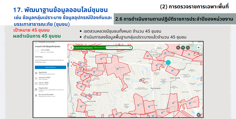 -17. พัฒนาฐานข้อมูลออนไลน์ชุมชน ได้แก่ ข้อมูลกลุ่มเปราะบาง ข้อมูลอุปกรณ์ป้องกันและบรรเทาสาธารณภัย (ชุมชน) : OKR 8.3.10ชุมชน45.0045.00100.00