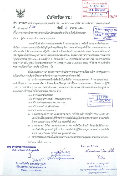 8 | รายงานผลการดำเนินการแก้ไขจุดเสี่ยงอุบัติเหตุ ครั้งที่ 1 ภายใน 4 มี.ค. 67 | 5.00 | 01-03-2024 | 04-03-2024 |