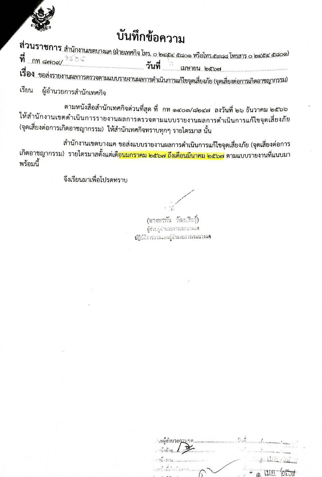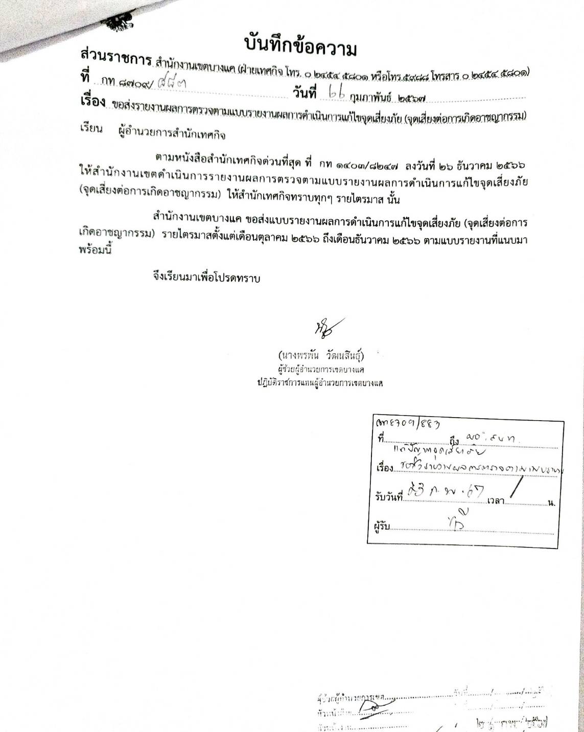 2 | จัดทำรายงานผลการดำเนินการแก้ไขจุดเสี่ยงอาชญากรรม ตามแแบบฟอร์มส่งสำนักเทศกิจทุกเดือน | 10.00 | 01-10-2023 | 30-09-2024 |