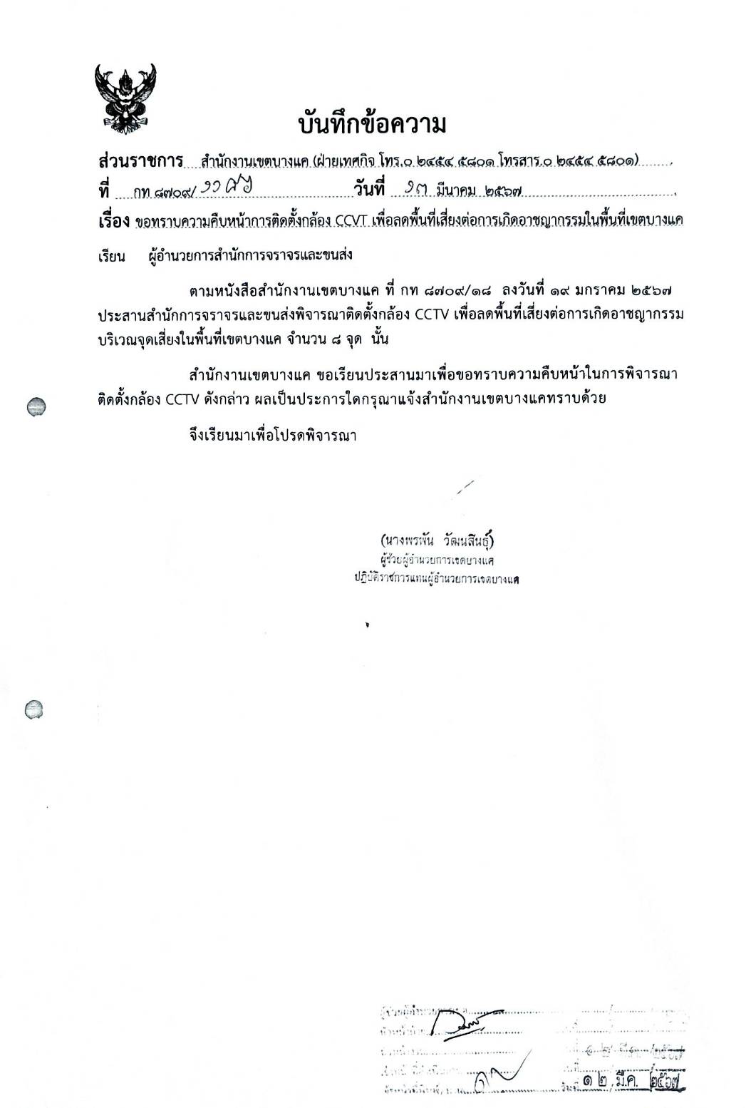 1 | จัดทำแผนดำเนินการพัฒนาลดความเสี่ยงของพื้นที่เสี่ยงต่อการเกิดอาชญากรรมของสำนักงานเขตบางแค และเสนอผู้บริหารกทม.เพื่อให้ความเห็นชอบ (ต้องประกอบด้วยบัญชีพื้นที่เสี่ยงฯและคำสั่งมอบหมาย) | 10.00 | 01-10-2023 | 31-12-2023 |