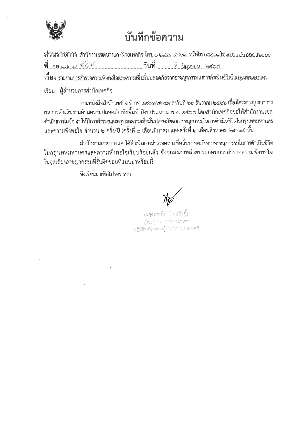 4 | รายงานผลการดำเนินงาน ปัญหา อุปสรรค และข้อเสนอแนะต่อการแก้ไขจุดเสี่ยงอาชญากรรม ให้ผู้บริหาร กทม. ทราบ | 10.00 | 01-08-2024 | 30-09-2024 |