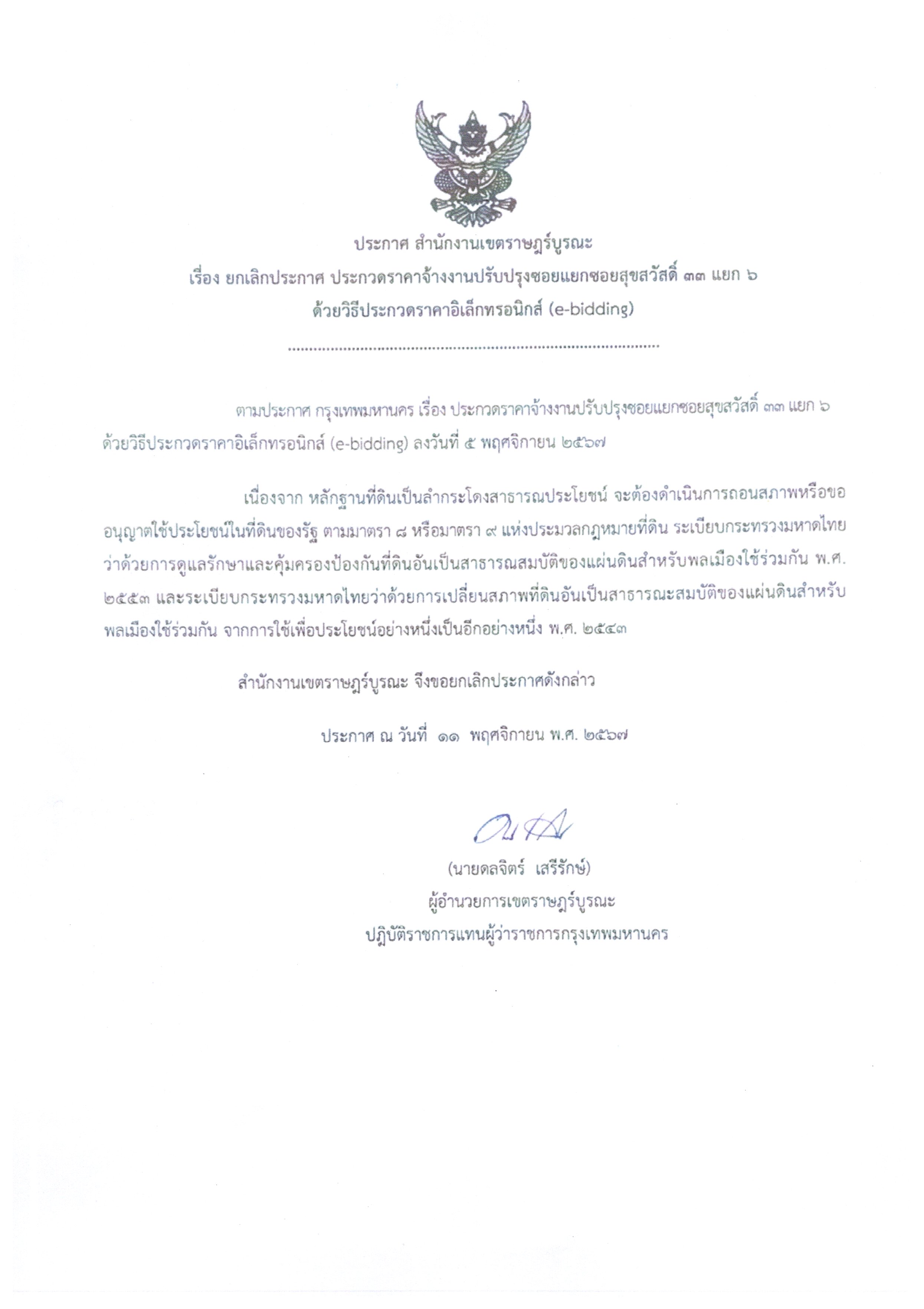 29-11-20240.00ยกเลิกโครงการ โดยมีเหตุผลตามประกาศสำนักงานเขตราษฎร์บูรณะ เรื่อง ยกเลิกประกาศ ประกวดราคาจ้างงานปรับปรุงซอยแยกซอยสุขสวัสดิ์ 33 แยก 6 ด้วยวิธีประกวดราคาอิเล็กทรอนิกส์ (e-bidding) ลงวันที่ 11 พฤศจิกายน 2567 ตามภาพที่แนบ