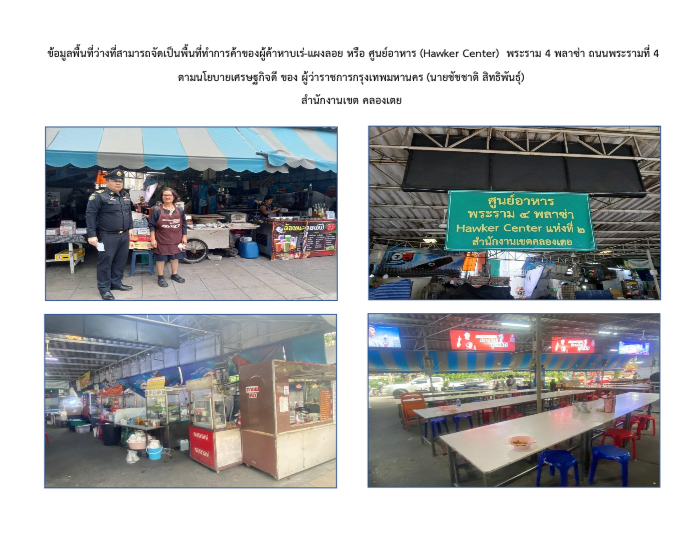 27-08-20241.00ดำเนินการจัดหาพื้นที่เอกชน บริเวณ ศูนย์อาหารพระราม 4 พลาซ่า ถนนพระรามที่ 4 โดย มีผู้ค้า ที่อยู่บนทางเท้าหน้าจุดทำการค้าบริเวณหน้า องค์การโทรศัพท์ และ ผู้ค้าทีี่ตั้งวางอยู่บริเวณบนทางเท้าสวนเพลิน และหน้าอาคารสิรินรัตน์ เข้าไปอยู่ใน Hawker center ศูนย์อาหารพระราม 4 พลาซ่า รองรับผู้ค้า จำนวน 20 แผงค้า แบ่งเป็น 23 ช่วงเวลา 06.00-14.00 น และ 14.00 - 22.00 น. รายละเอียด แผง ค้า 1.5 X 1.5 ต่อแผง โดยดำเนินการแล้วเสร็จ เมื่อวันที่ 27 สิงหาคม 2567