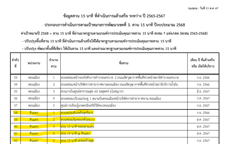 25-06-20257.00สำนักงานเขตดินแดงดำเนินการจัดทำสวน 15 นาทีทั้งหมด 8 แห่ง ได้รับการประเมินจากคณะกรรมการสวน 15 นาที โดยผ่านการประเมิน 7 แห่ง จาก 8 แห่ง อยู่ระหว่างการปรับปรุงตามคำแนะนำของคณะกรรมการ