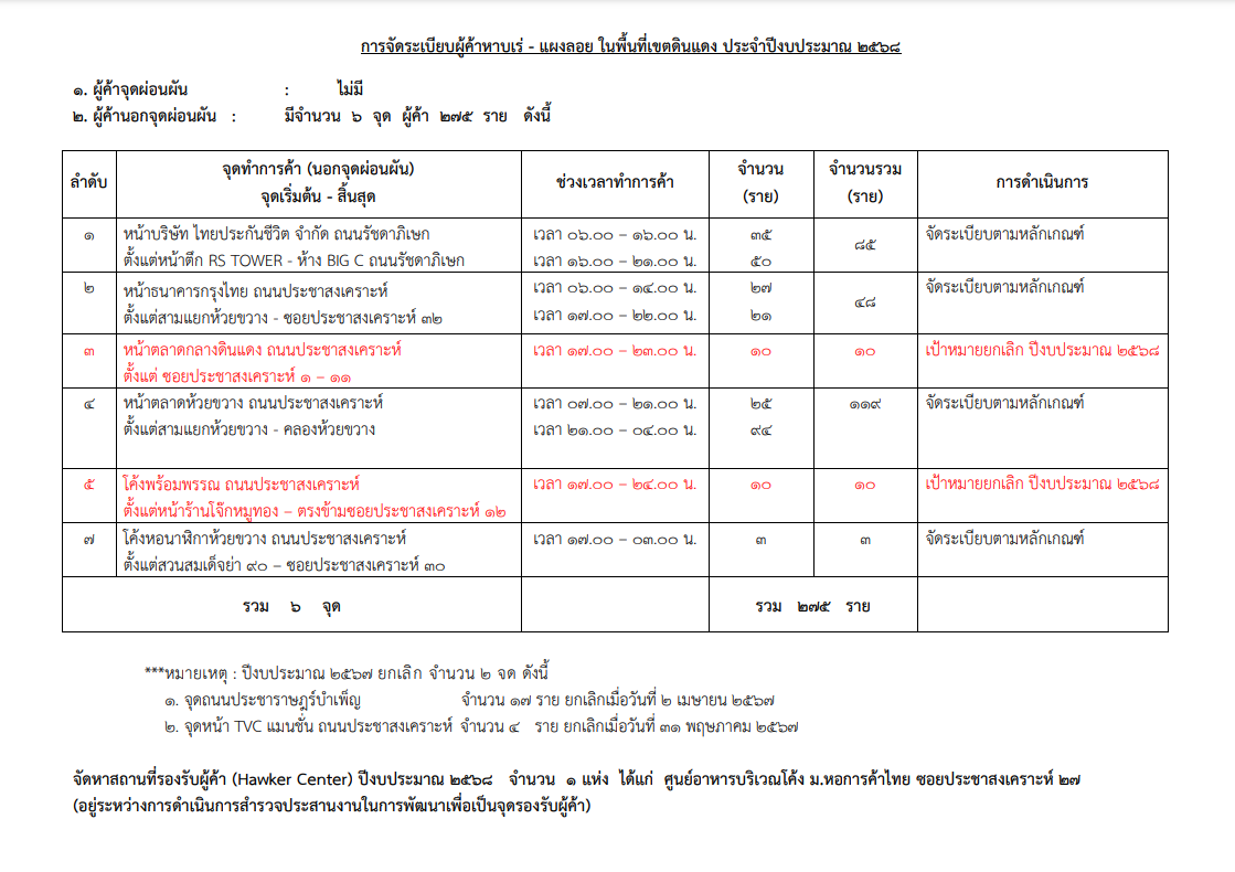 ![]() | 09-12-2024 | 1.00 | ดำเนินการยกเลิกจุดหาบเร่บริเวณถนนประชาราษฎร์บำเพ็ญ เมื่อวันที่ 2 เมษายน 2567 เรียบร้อยแล้ว | ||