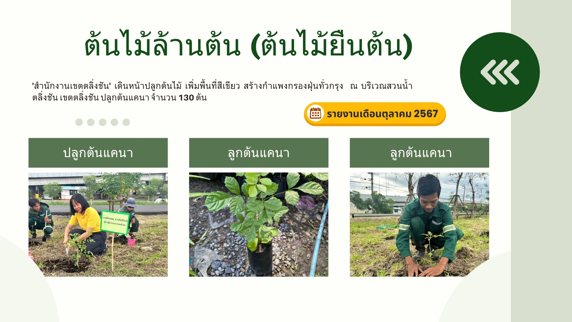 ![]() | - | ปลูกต้นไม้ล้านต้น (ไม้ยืนต้น) | 0.00 | 100.00 | สำนักงานเขตตลิ่งชัน | ฝ่ายรักษาความสะอาดและสวนสาธารณะ |