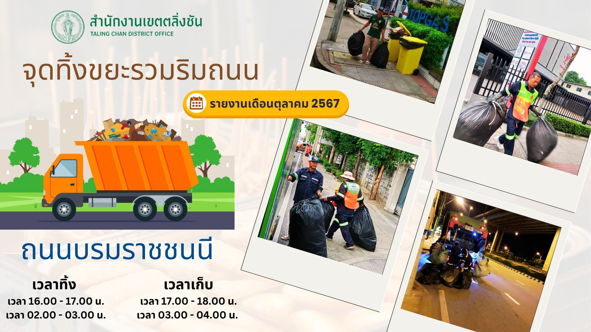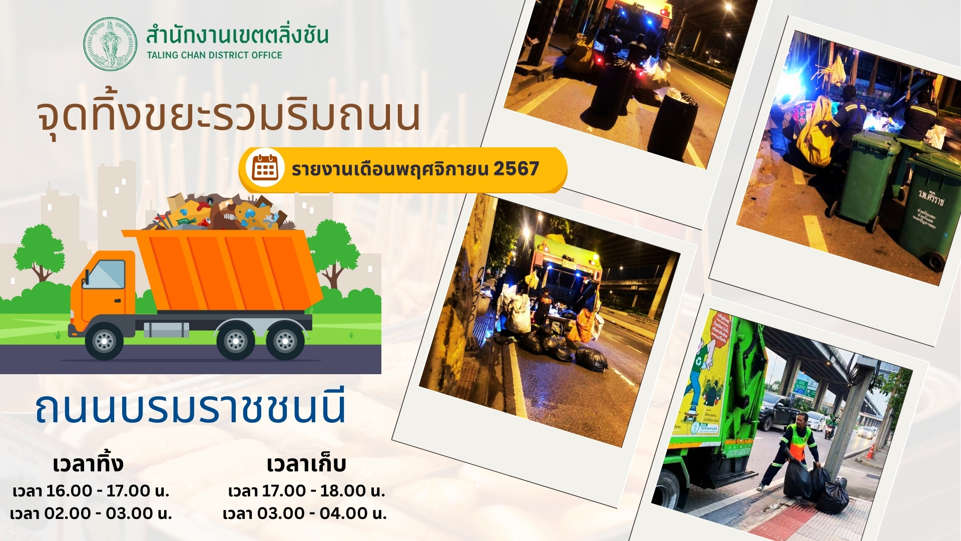 ![]() | 24-04-2025 | 0.00 | ![]() | ผลการดำเนินการเดือนเมษายน 2568 (วันที่ 24 มีนาคม - 23 เมษายน 2568) กำหนดพื้นที่ ถนนบรมราชชนนี เป็นพืีนที่เป้าหมาย โดยกำหนดเวลาทิ้ง เวลา 16.00 - 17.00 น. และ เวลา 02.00 - 03.00 น. สำหรับเวลาเก็บ เวลา 17.00 - 18.00 น. และเวลา 03.00 - 04.00 น. จำนวน 24 จุด | |