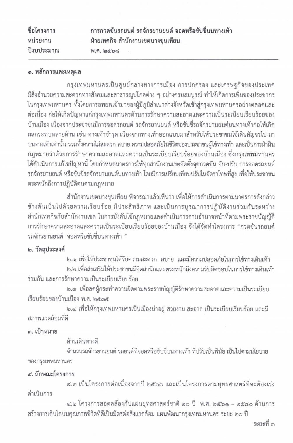 ![]() | 15-11-2024 | 95.00 | 2. วัตถุประสงค์ 2.1 เพื่อให้ประชาชนได้รับความสะดวก สบาย และมีความปลอดภัยในการใช้ทางเดินเท้า 2.2 เพื่อส่งเสริมให้ประชาชนมีจิตสำนึกและตระหนักถึงความรับผิดชอบในการใช้ทางเดินเท้าร่วมกัน และการรักษาความเป็นระเบียบเรียบร้อย 2.3 เพื่อลดผู้กระทำความผิดตามพระราชบัญญัติรักษาความสะอาดและความเป็นระเบียบ เรียบร้อยของบ้านเมือง พ.ศ. 2535 2.4 เพื่อให้กรุงเทพมหานครเป็นเมืองน่าอยู่ สวยงาม สะอาด เป็นระเบียบเรียบร้อย และมี สภาพแวดล้อมที่ดี 3. เป้าหมาย ด้านเดินทางดี จำนวนรถจักรยานยนต์ รถยนต์ที่จอดหรือขับขี่บนทางเท้า ที่ปรับเป็นพินัย เป็นไปตามนโยบายของกรุงเทพมหานคร | ||