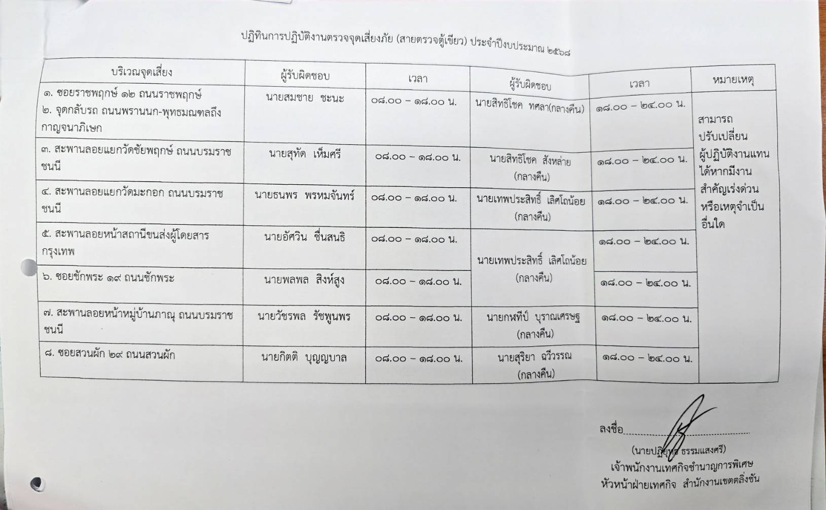 ![]() | 26-11-2024 | 0.00 | ![]() | จัดทำบัญชีพื้นที่เสี่ยง มีทั้งหมดจำนวน 9 แห่ง 1.ซอยราชพฤกษ์ 12 2.จุดกลับรถใต้สะพานยกระดับถนนพรานนก-พุทธมณฑล 3.สะพานลอยแยกวัดชัยพฤกษ์ ถนนบรมราชชนนี 4.สะพานลอยหน้าวัดมะกอก ถนนบรมราชชนนี 5.สะพานลอยหน้าสถานีขนส่งสายใต้ใหม่ 6.ซอยชักพระ 19 ถนนชักพระ 7.ซอยสวนผัก 29 ถนนสวนผัก 8.สะพานลอยหน้าหมู่บ้านภานุ 9.อาคารวัฏจักร ถนนบรมราชนนี | |