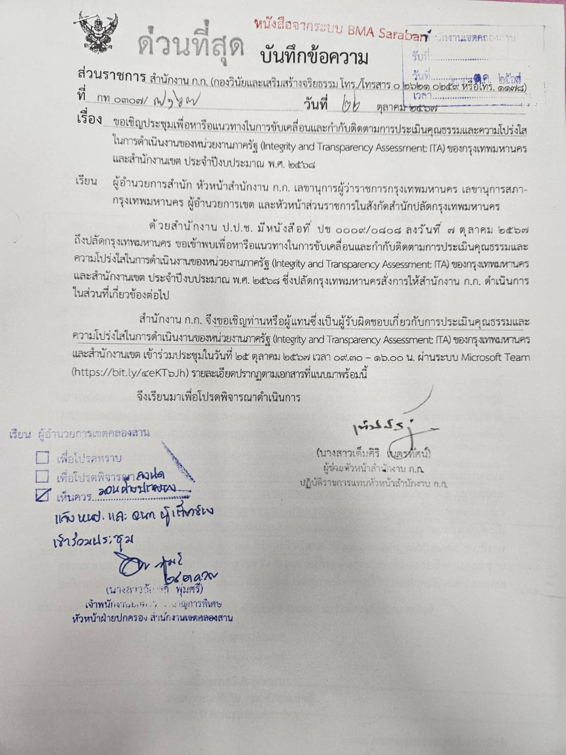 1 | ประชุมหารือแนวทางในการขับเคลื่อนและกำกับติดตามการประเมินคุณธรรมและความโปร่งใสในการดำเนินงานของหน่วยงานภาครัฐ (Integrity and Transparency Assessment : ITA) ของกรุงเทพมหานครและสำนักงานเขต กรุงเทพมหานคร ประจำปีงบประมาณ พ.ศ. 2568 | 20.00 | 01-10-2024 | 30-11-2024 |