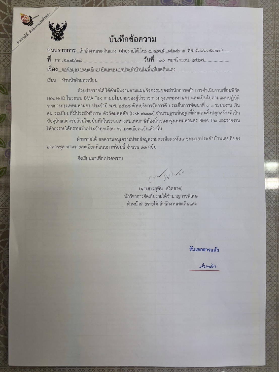 560 เลขหมายไม่สามารถบันทึกข้อมูลได้เนื่องจากไม่มีเลขหมายประจำบ้านในระบบฐานข้อมูล เนื่องจากอาคารดังกล่าว มีแต่ House ID ของอาคาร แต่ไม่มีของห้องชุด แจ้งให้กองรายได้ทราบแล้ว