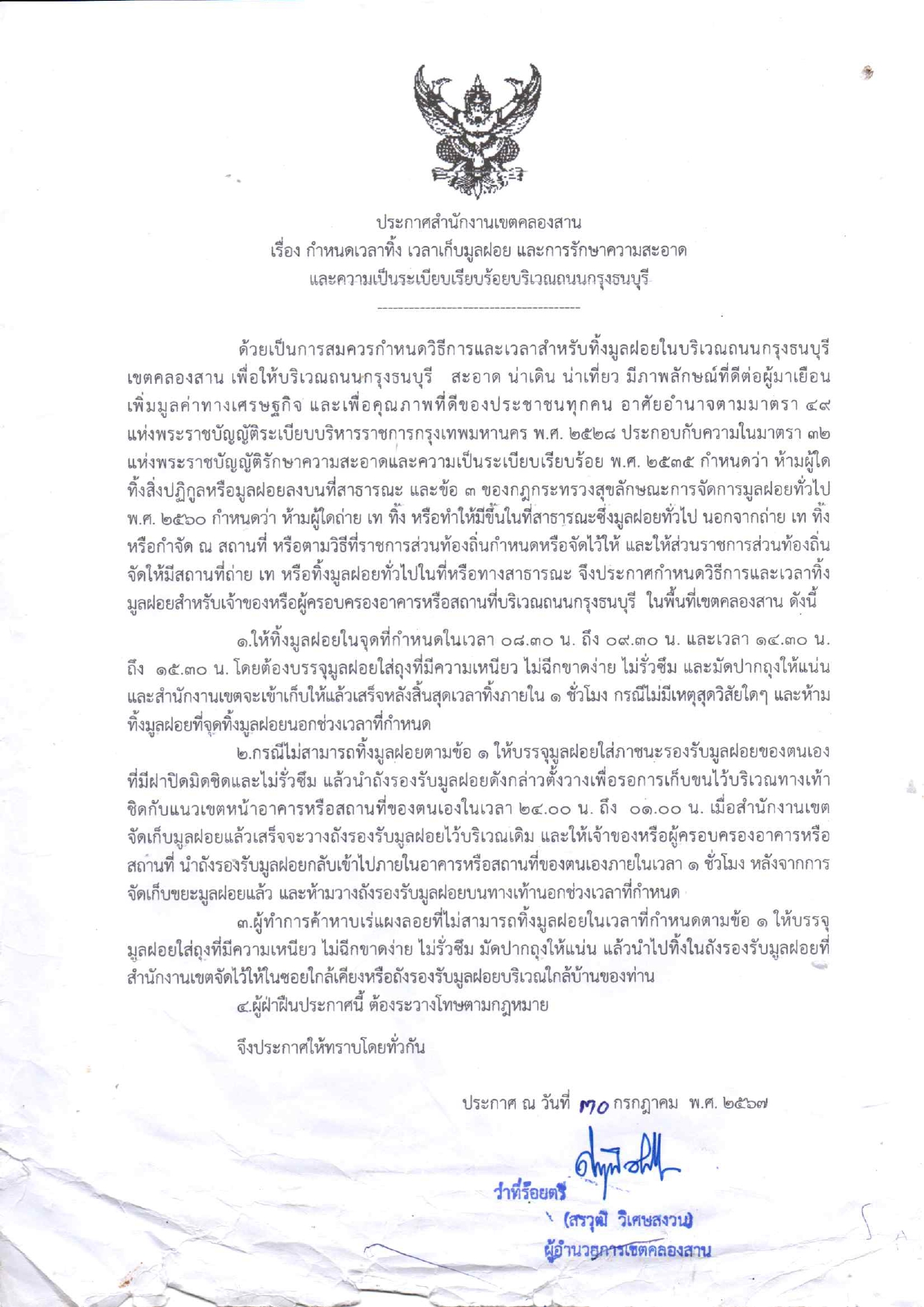 31-10-20241.00กำหนดพื้นที่ ถนนกรุงธนบุรี เป็นพื้นที่เป้าหมาย โดยกำหนดเวลาทิ้ง เวลา 08.30 - 09.30 น. และ เวลา 14.30 - 15.30 น. สำหรับเวลาเก็บ เวลา 09.30 - 10.30 น. และเวลา 15.30 - 16.30 น.