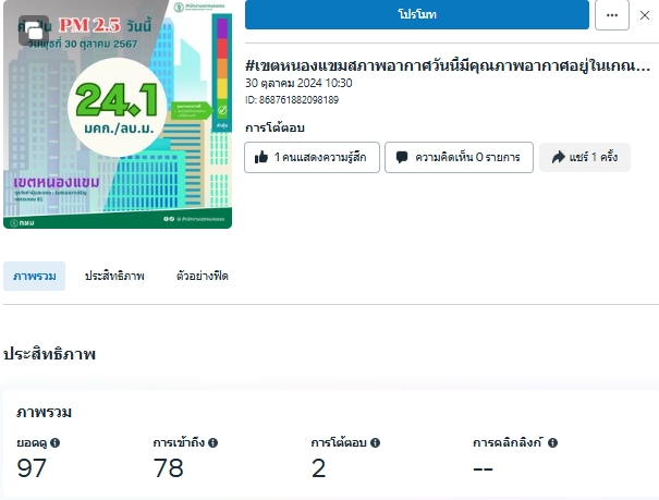 1 | มอบหมายเจ้าหน้าที่ปฏิบัติงานและเผยแพร่ข้อมูลข่าวสารของสำนักงานเขตหนองแขมผ่าน Social Media เดือนตุลาคม 2567 | 10.00 | 01-10-2024 | 31-10-2024 |