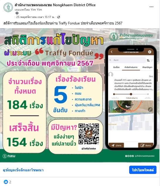 2 | เผยแพร่ข้อมูลข่าวสารของสำนักงานเขตหนองแขมผ่าน Social Media เดือนพฤศจิกายน 2567 | 10.00 | 01-11-2024 | 30-11-2024 |