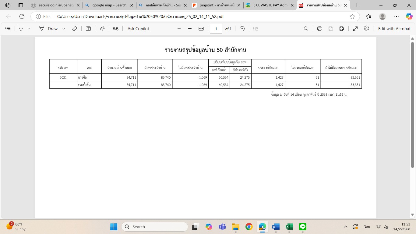 ![]() | 26-05-2025 | 0.00 | ดำเนินการตรวจสอบและแก้ไขข้อมูลอาคาร โดยปักหมุดพิกัดบ้าน จำนวน 4,828 หลัง ลงทะเบียนคัดแยกขยะ จำนวน 2,194 หลัง |
