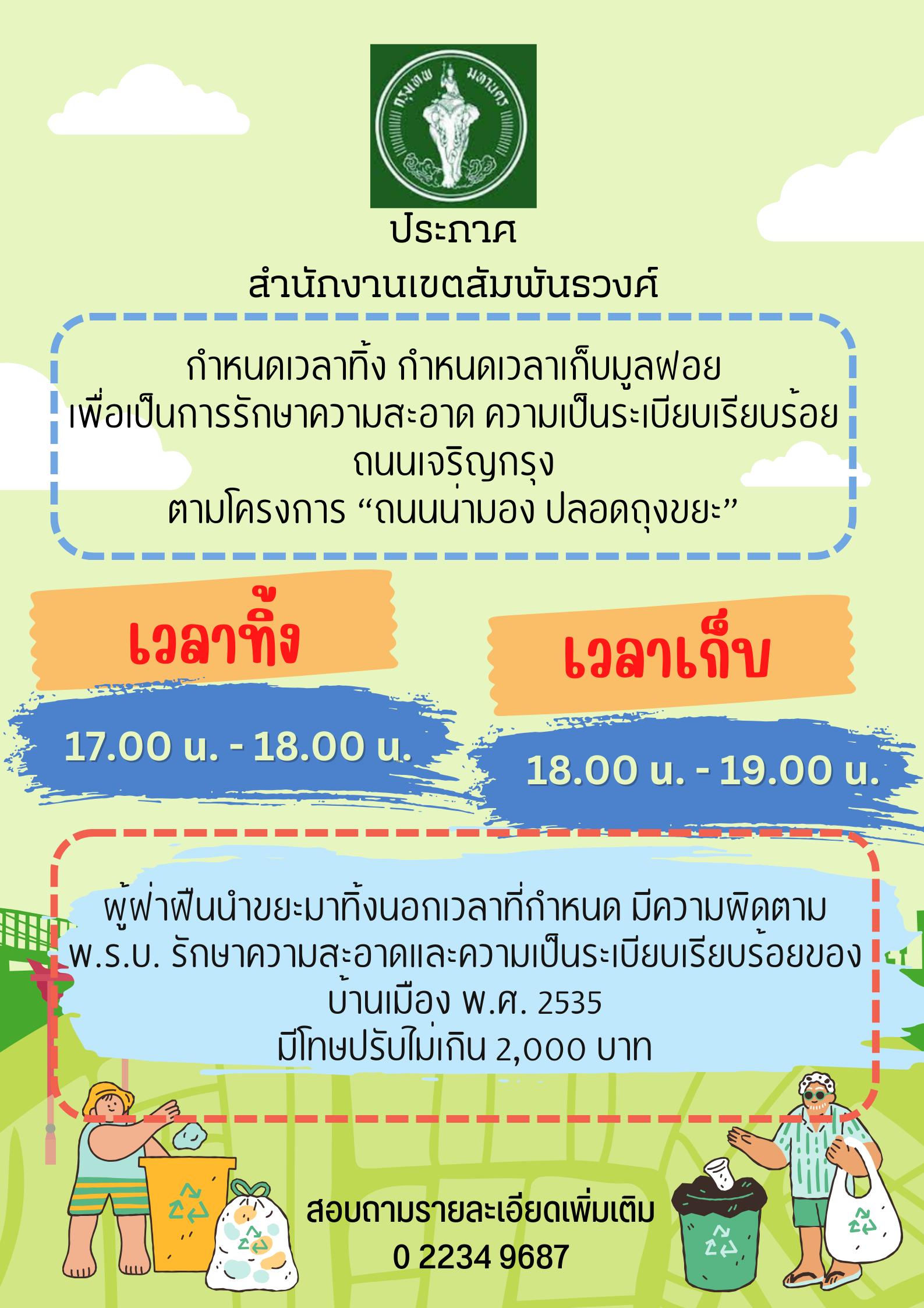 จุดรวมทิ้งขยะ จำนวน 1 ถนนถนนเจริญกรุง (เริ่มจากทิพยเสถียร - สะพานดำรงสถิต) มีจุดรวม จำนวน 3 จุด ช่วงเวลา 18.00 - 19.00 น.