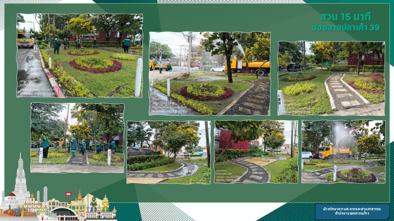 04-07-20259.00ฝ่ายรักษาความสะอาดและสวนสาธารณะ ปี 2566-2568 มีสวน 15 นาทีที่ผ่านการตรวจมาตรฐานแล้ว จำนวน 9 สวน แบ่งเป็น สะสม 2 สวน และสวนใหม่ 7 สวน 1. สวนสุคนธสวัสดิ์ 2. สวนผลาสินธุ์ 3. สวนปลาเค้าภิรมย์ 4. สวนอยู่เย็นเป็นสุข 5. สวนเฟรนชิฟ ซอยประเสริฐมนูกิจ 29 แยก 2 6. สวนเฟรนชิฟ 3 7. สวนลาดปลาเค้า ซอย 39 8. สวนเฟรนชิฟ 4 9. สวนเฟรนชิฟ 2