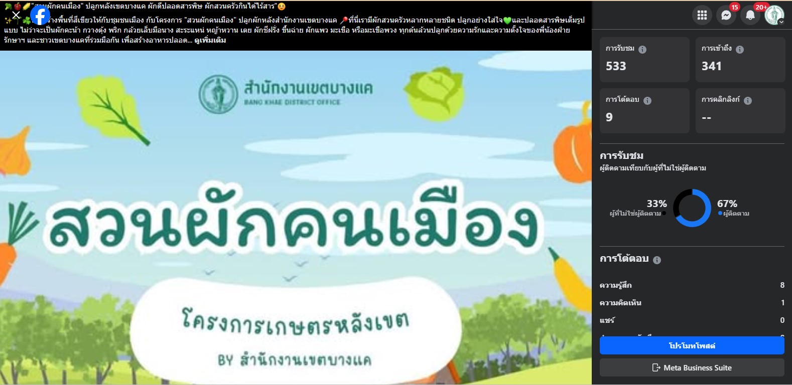 | 11-12-2024 | 542.00 |  | จำนวนการมีส่วนร่วมกับสื่อประชาสัมพันธ์ เรื่อง "สวนผักคนเมือง" ปลูกหลังเขตบางแค ผักดีปลอดสารพิษ ผักสวนครัวกินได้ไร้สาร ที่เผยแพร่ (Engagement) ผ่านช่องทาง Facebook สำนักงานเขตบางแค เมื่อวันที่ 7 ตุลาคม 2567 = 542 | |