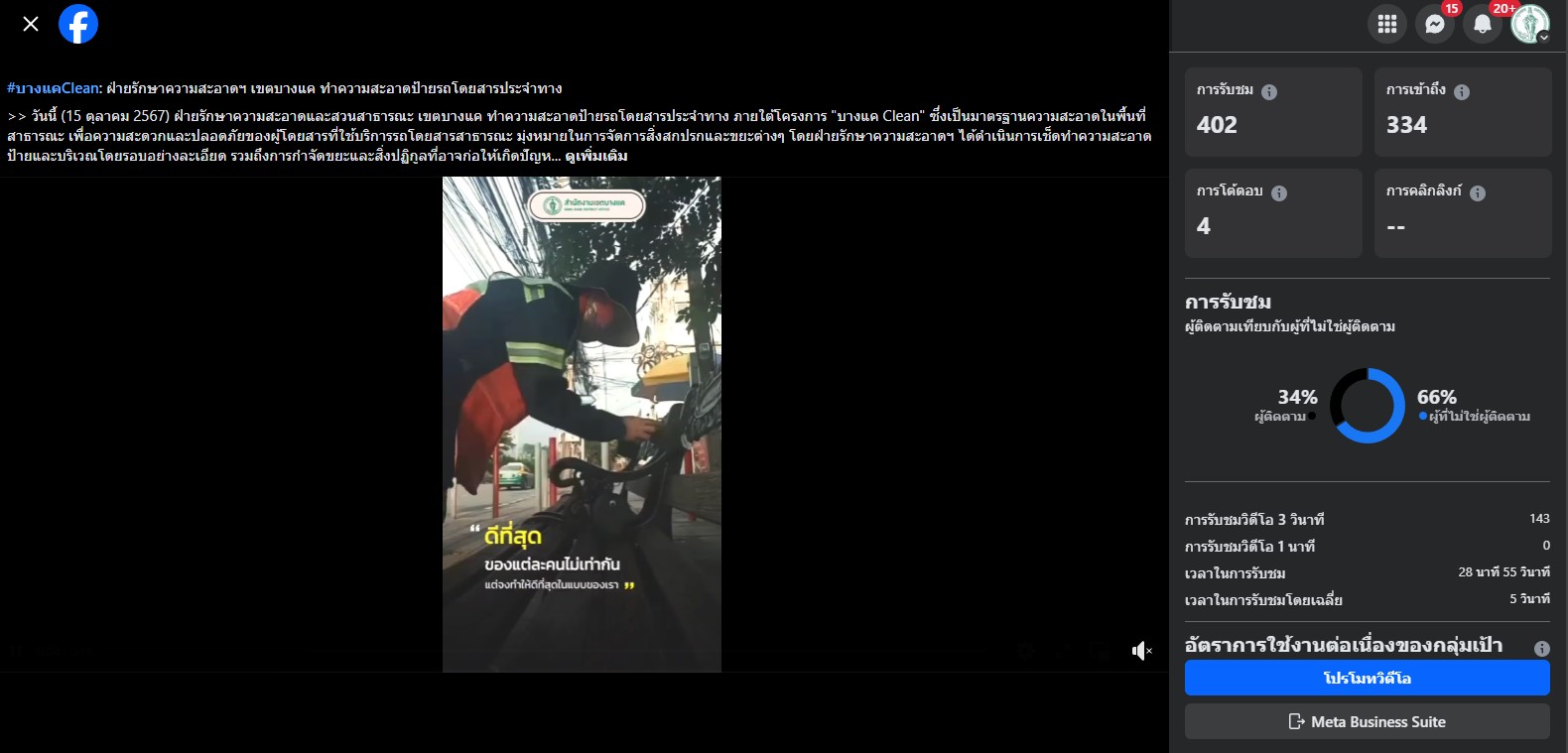 | 11-12-2024 | 406.00 |  | จำนวนการมีส่วนร่วมกับสื่อประชาสัมพันธ์ เรื่อง บางแคClean: ฝ่ายรักษาความสะอาดฯ เขตบางแค ทำความสะอาดป้ายรถโดยสารประจำทาง ที่เผยแพร่ (Engagement) ผ่านช่องทาง Facebook สำนักงานเขตบางแค เมื่อวันที่ 15 ตุลาคม 2567 = 406 | |