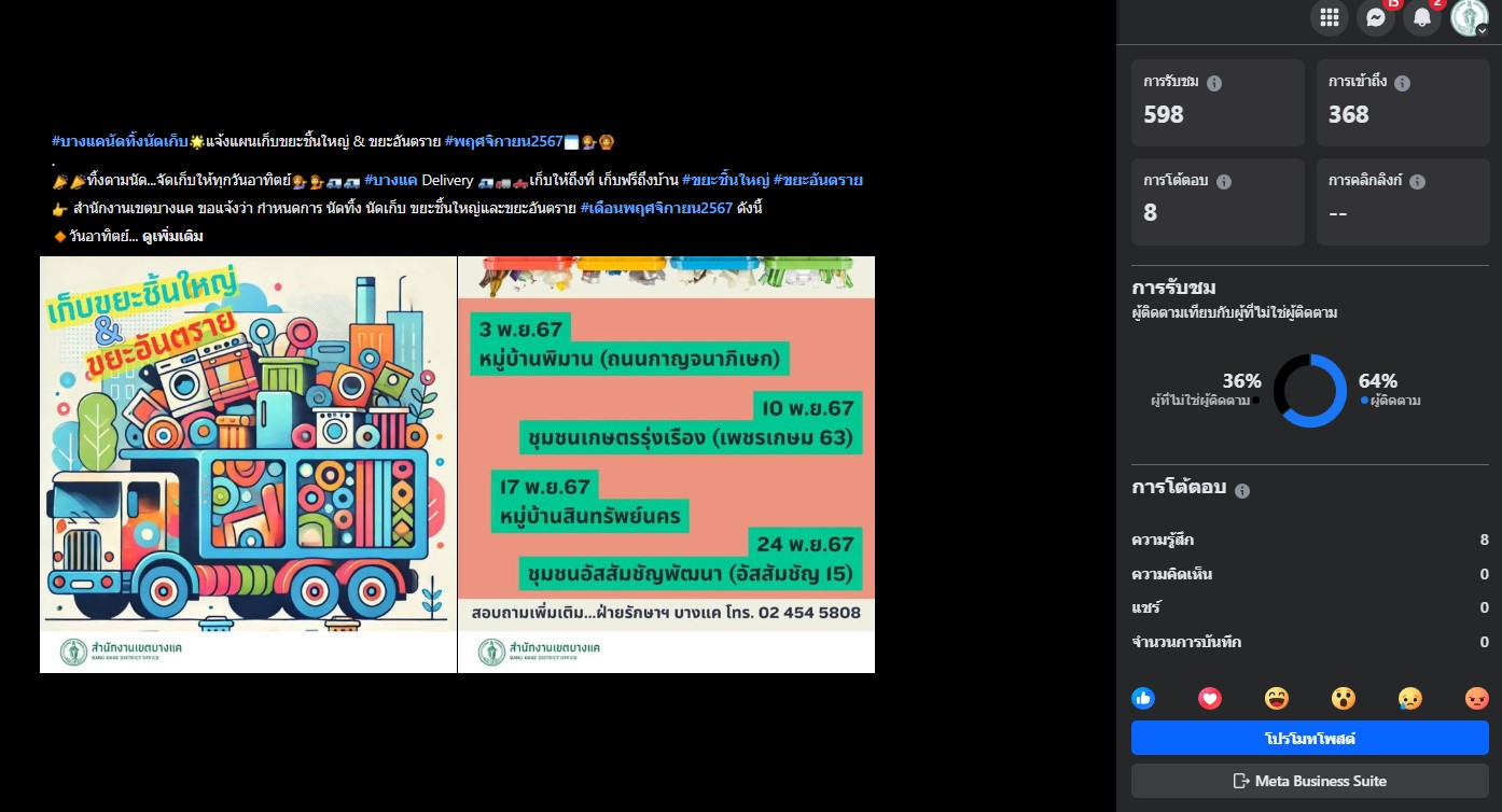 | 13-12-2024 | 606.00 |  | จำนวนการมีส่วนร่วมกับสื่อประชาสัมพันธ์ เรื่อง บางแค นัดทิ้งนัดเก็บ แจ้งแผนเก็บขยะชิ้นใหญ่ & ขยะอันตราย ประจำเดือนพฤศจิกายน 2567 ที่เผยแพร่ (Engagement) ผ่านช่องทาง Facebook สำนักงานเขตบางแค เมื่อวันที่ 27 ตุลาคม 2567 = 606 | |