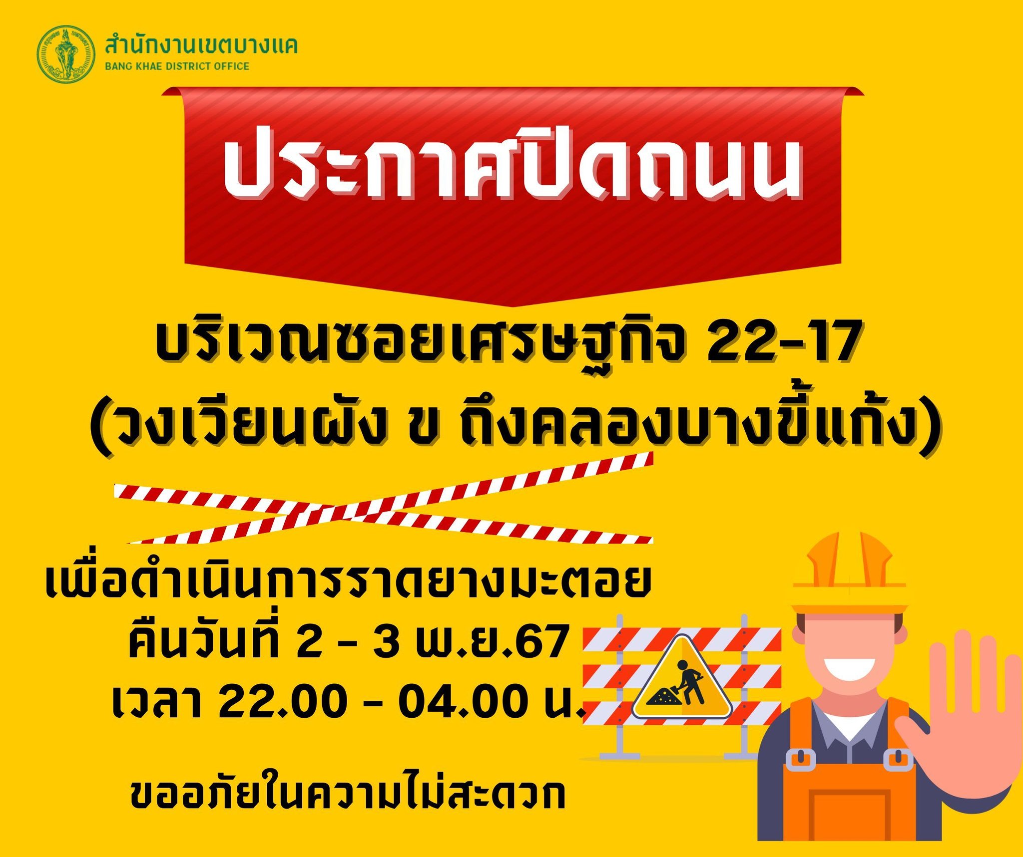 | 13-12-2024 | 1.00 |  | สื่อประชาสัมพันธ์ เรื่อง เขตบางแค ประกาศปิดถนน ซอยหมู่บ้านเศรษฐกิจ 22-17 เพื่อราดยางมะตอย คืนวันที่ 2-3 พฤศจิกายน 2567 ที่เผยแพร่ ผ่านช่องทาง Facebook สำนักงานเขตบางแค เมื่อวันที่ 2 พฤศจิกายน 2567 | |