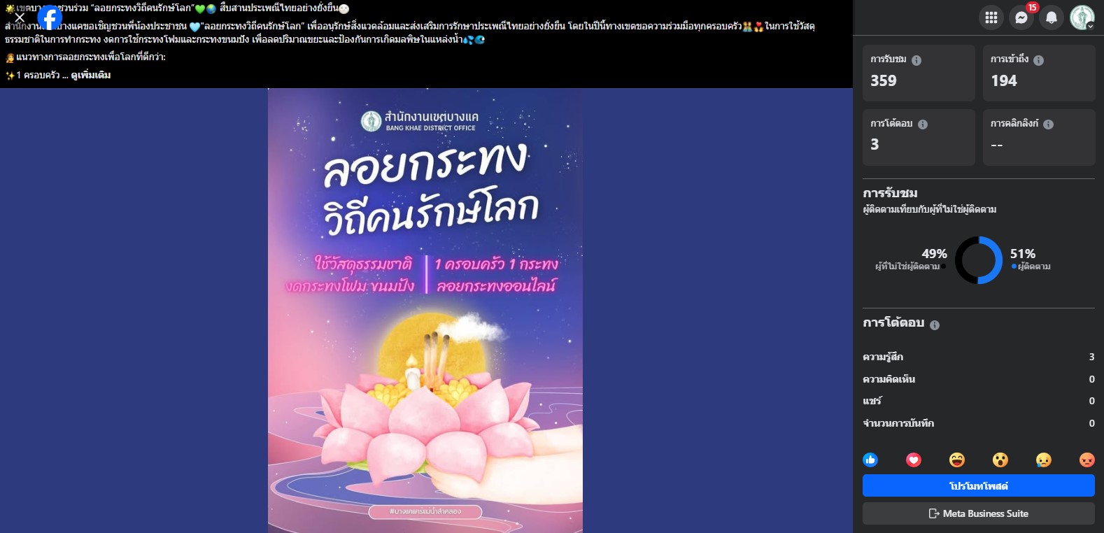 | 13-12-2024 | 1.00 |  | สื่อประชาสัมพันธ์ เรื่อง เขตบางแคชวนร่วม “ลอยกระทงวิถีคนรักษ์โลก” สืบสานประเพณีไทยอย่างยั่งยืน ที่เผยแพร่ ผ่านช่องทาง Facebook สำนักงานเขตบางแค เมื่อวันที่ 7 พฤศจิกายน 2567 | |