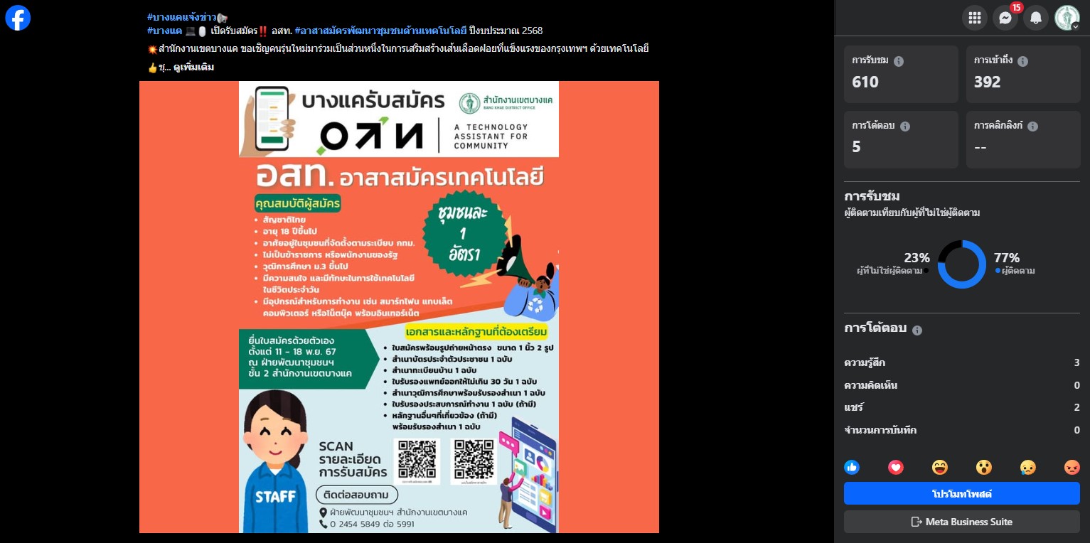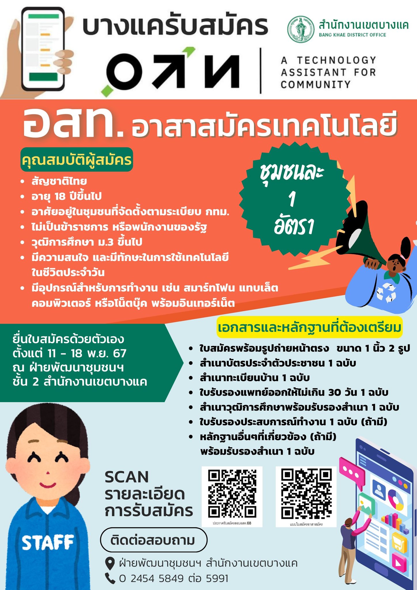 | 13-12-2024 | 1.00 |  | สื่อประชาสัมพันธ์ เรื่อง บางแค เปิดรับสมัคร อสท. #อาสาสมัครพัฒนาชุมชนด้านเทคโนโลยี ปีงบประมาณ 2568 ที่เผยแพร่ ผ่านช่องทาง Facebook สำนักงานเขตบางแค เมื่อวันที่ 9 พฤศจิกายน 2567 | |