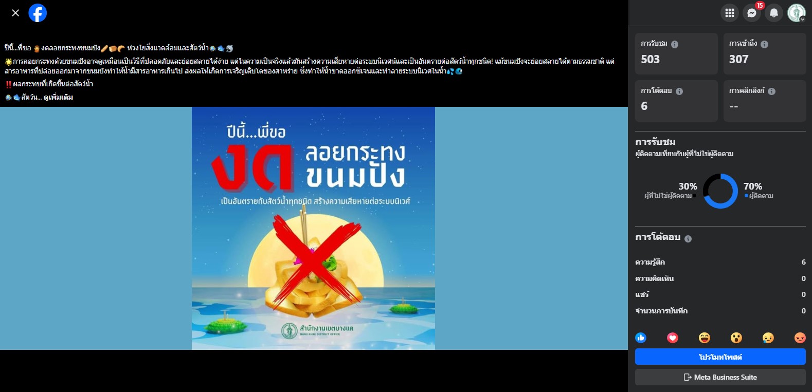 | 13-12-2024 | 1.00 |  | สื่อประชาสัมพันธ์ เรื่อง ปีนี้...พี่ขอ งดลอยกระทงขนมปัง ห่วงใยสิ่งแวดล้อมและสัตว์น้ำ ที่เผยแพร่ ผ่านช่องทาง Facebook สำนักงานเขตบางแค เมื่อวันที่ 12 พฤศจิกายน 2567 | |