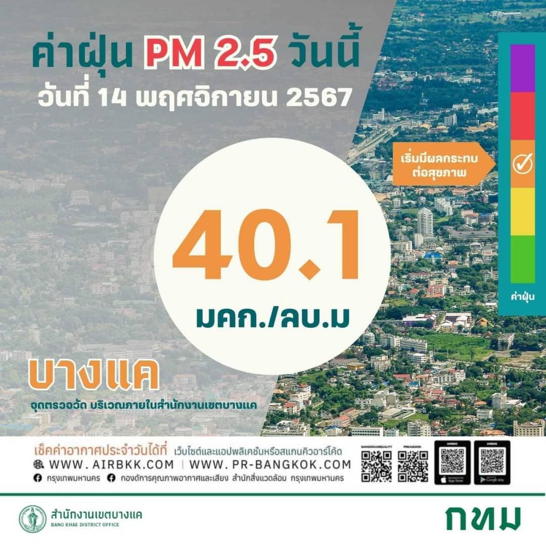 | 13-12-2024 | 1.00 |  | สื่อประชาสัมพันธ์ เรื่อง ฝุ่นบางแคเช้านี้ สีส้ม #บางแครายงานคุณภาพอากาศ ที่เผยแพร่ ผ่านช่องทาง Facebook สำนักงานเขตบางแค เมื่อวันที่ 14 พฤศจิกายน 2567 | |