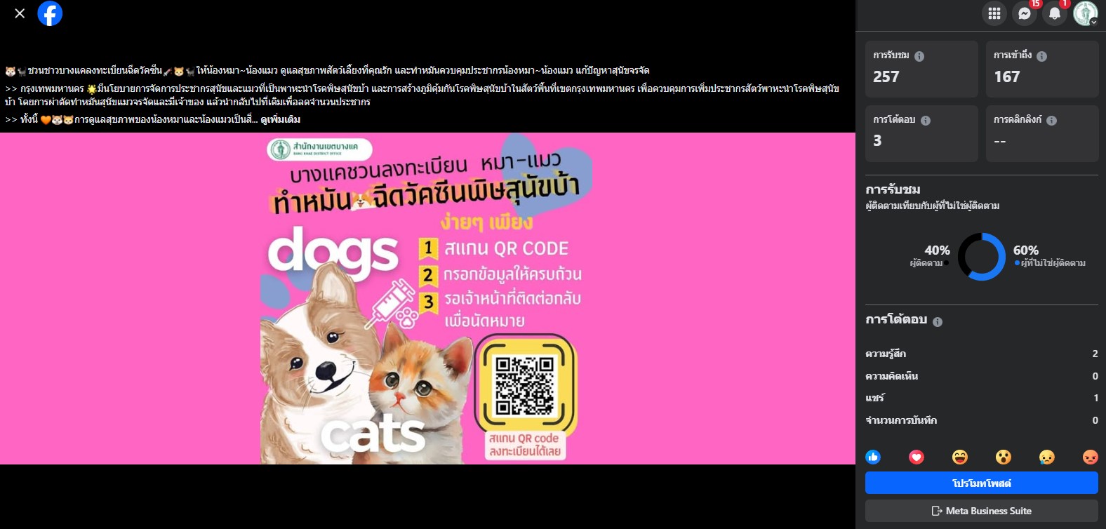 | 13-12-2024 | 260.00 |  | จำนวนการมีส่วนร่วมกับสื่อประชาสัมพันธ์ เรื่อง ชวนชาวบางแคลงทะเบียนฉีดวัคซีน ให้น้องหมา~น้องแมว ดูแลสุขภาพสัตว์เลี้ยงที่คุณรัก และทำหมันควบคุมประชากรน้องหมา~น้องแมว แก้ปัญหาสุนัขจรจัด ที่เผยแพร่ (Engagement) ผ่านช่องทาง Facebook สำนักงานเขตบางแค เมื่อวันที่ 14 พฤศจิกายน 2567 = 260 | |