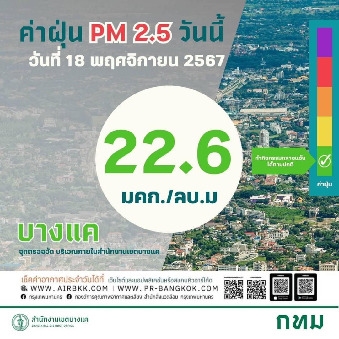 | 13-12-2024 | 1.00 |  | สื่อประชาสัมพันธ์ เรื่อง ฝุ่นบางแคเช้านี้ #อากาศดี #สีเขียว #บางแครายงานคุณภาพอากาศ ที่เผยแพร่ ผ่านช่องทาง Facebook สำนักงานเขตบางแค เมื่อวันที่ 18 พฤศจิกายน 2567 | |