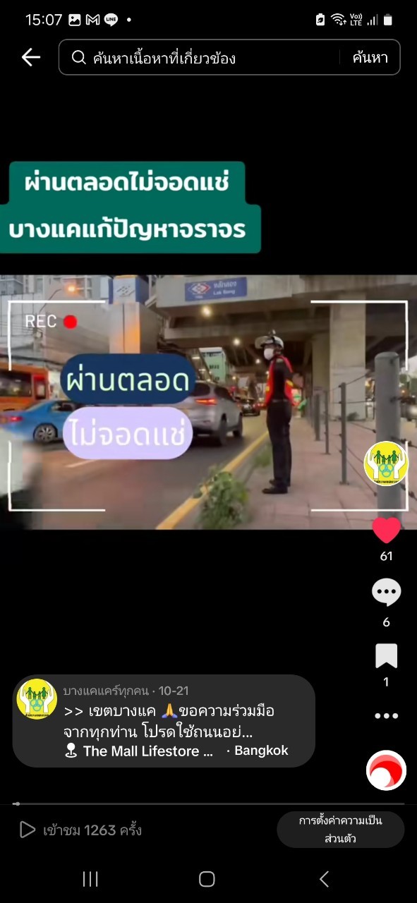 | 11-12-2024 | 1.00 | _241204_15.jpg) | สื่อประชาสัมพันธ์ เรื่อง "ผ่านตลอด ไม่จอดแช่" บางแค แก้ปัญหาจราจร ที่เผยแพร่ ผ่านช่องทาง TIKTOK บางแคแคร์ทุกคน เมื่อวันที่ 21 ตุลาคม 2567 | |