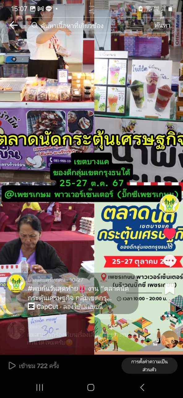 | 11-12-2024 | 1.00 | _241204_14.jpg) | สื่อประชาสัมพันธ์ เรื่อง “ตลาดนัด กระตุ้นเศรษฐกิจ กลุ่มเขตกรุงธนใต้ " ที่เผยแพร่ ผ่านช่องทาง TIKTOK บางแคแคร์ทุกคน เมื่อวันที่ 27 ตุลาคม 2567 | |