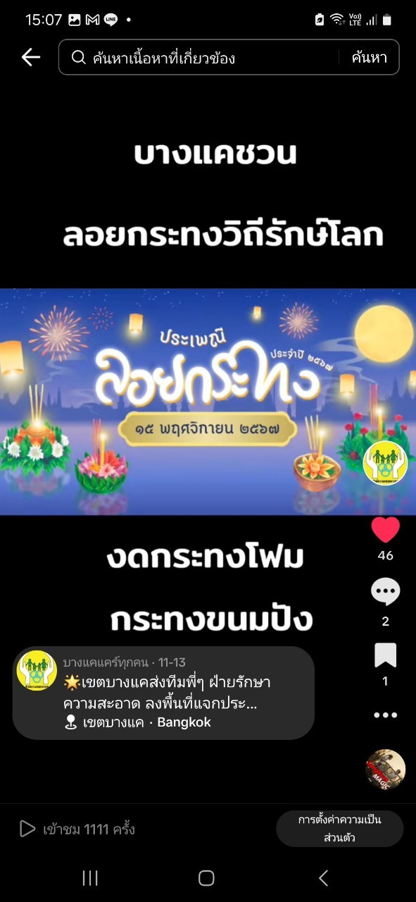 | 11-12-2024 | 1,160.00 | _241204_13.jpg) | จำนวนการมีส่วนร่วมกับสื่อประชาสัมพันธ์ เรื่อง บางแค ชวนประชาชนร่วมลอยกระทงรักษ์โลก! ร่วมใจใช้วัสดุธรรมชาติ งดกระทงโฟม งดกระทงขนมปัง ไม่จุดพลุ ที่เผยแพร่ (Engagement) TIKTOK บางแคแคร์ทุกคน เมื่อวันที่ 13 พฤศจิกายน 2567 = 1160 | |