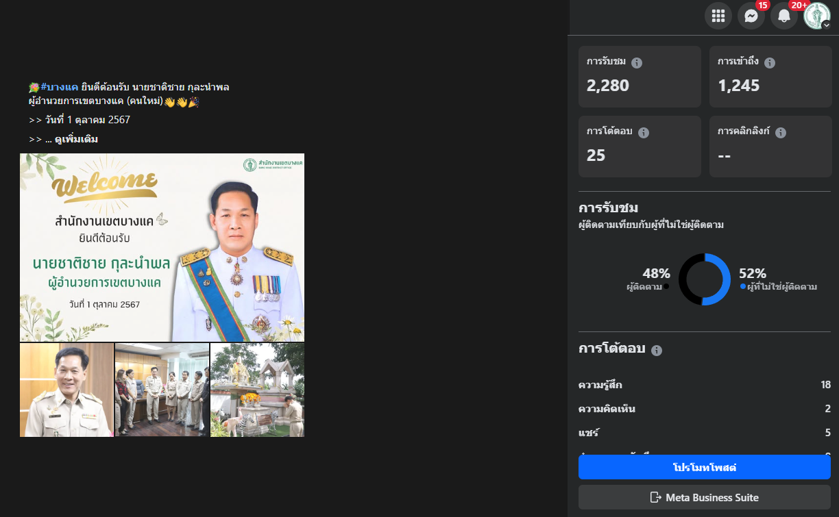 | 11-12-2024 | 2,305.00 |  | จำนวนการมีส่วนร่วมกับสื่อประชาสัมพันธ์ เรื่อง บางแค ยินดีต้อนรับ นายชาติชาย กุละนำพล ผู้อำนวยการเขตบางแค (คนใหม่) ที่เผยแพร่ (Engagement) ผ่านช่องทาง Facebook สำนักงานเขตบางแค เมื่อวันที่ 1 ตุลาคม 2567 = 2305 | |