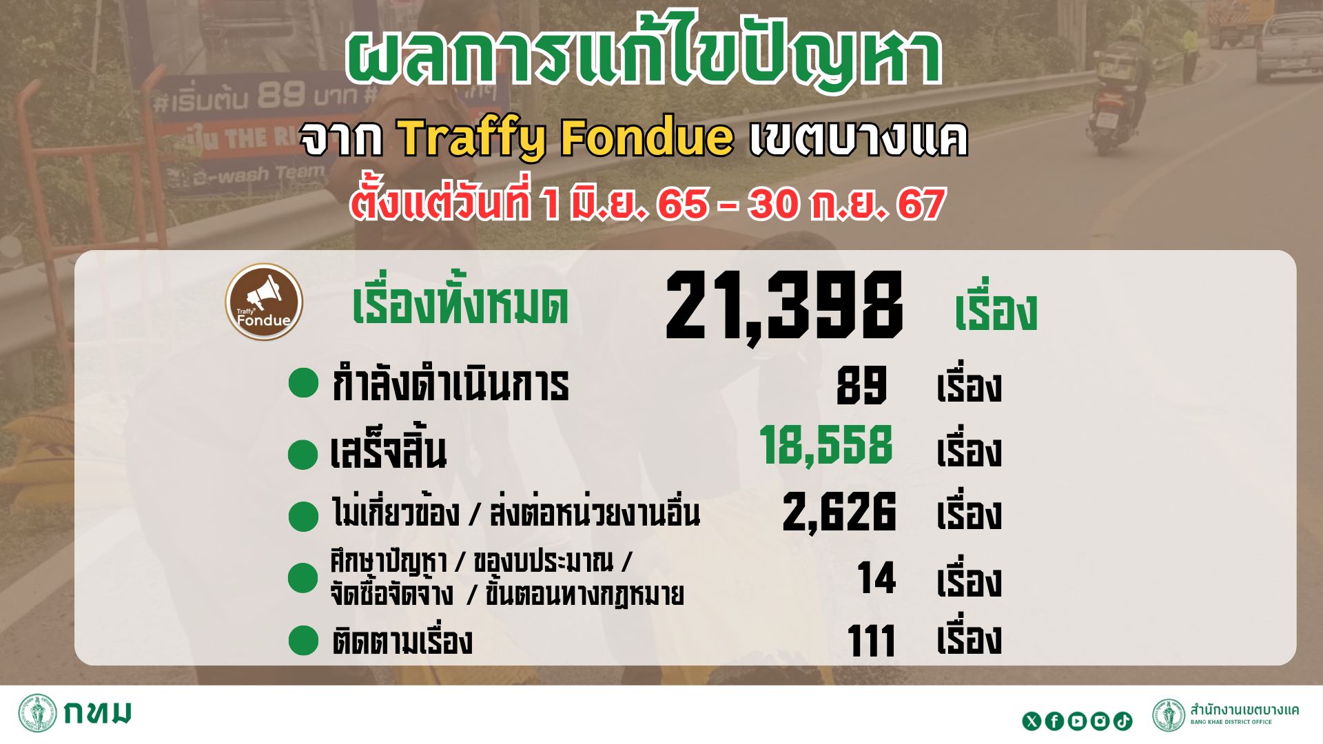 | 11-12-2024 | 1.00 |  | สื่อประชาสัมพันธ์ เรื่อง บางแค แจ้งสถิติเรื่องร้องเรียน จาก Traffy Fondue เขตบางแค ประจำเดือน กันยายน 2567 ที่เผยแพร่ ผ่านช่องทาง Facebook สำนักงานเขตบางแค เมื่อวันที่ 2 ตุลาคม 2567 | |