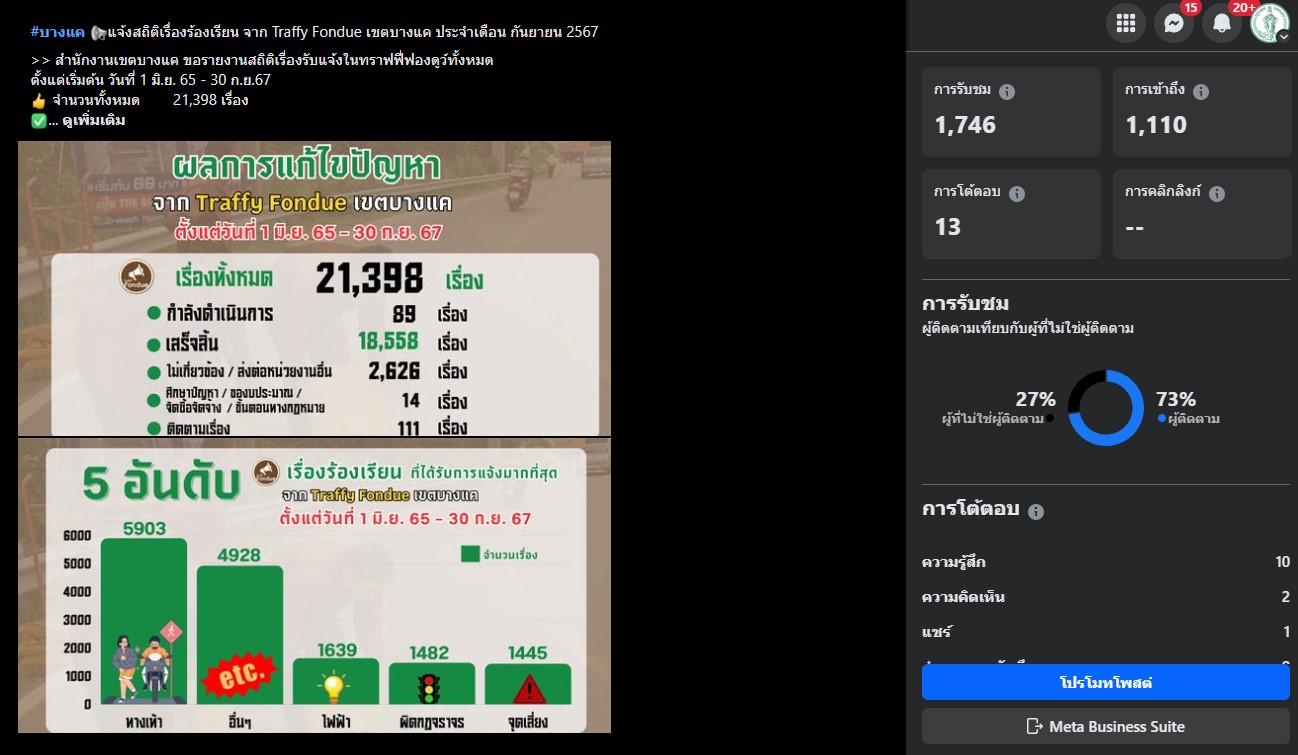 | 11-12-2024 | 1,765.00 |  | จำนวนการมีส่วนร่วมกับสื่อประชาสัมพันธ์ เรื่อง บางแค แจ้งสถิติเรื่องร้องเรียน จาก Traffy Fondue เขตบางแค ประจำเดือน กันยายน 2567 ที่เผยแพร่ (Engagement) ผ่านช่องทาง Facebook สำนักงานเขตบางแค เมื่อวันที่ 2 ตุลาคม 2567 = 1765 | |