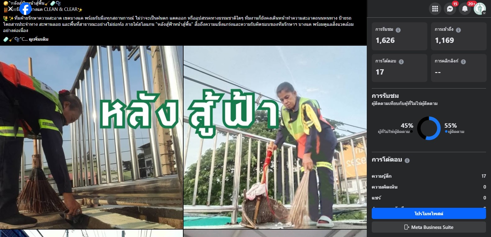 | 11-12-2024 | 1,643.00 |  | จำนวนการมีส่วนร่วมกับสื่อประชาสัมพันธ์ เรื่อง หลังสู้ฟ้าหน้าสู้พื้น ฝ่ายรักษาฯบางแค CLEAN & CLEAR ที่เผยแพร่ (Engagement) ผ่านช่องทาง Facebook สำนักงานเขตบางแค เมื่อวันที่ 8 ตุลาคม 2567 = 1643 | |