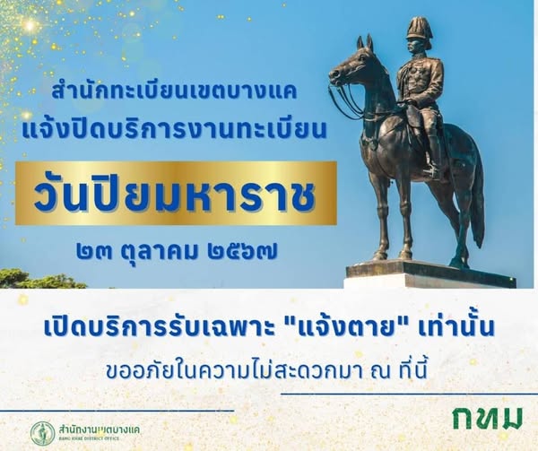 | 11-12-2024 | 1.00 |  | สื่อประชาสัมพันธ์ เรื่อง บางแค แจ้งงดให้บริการงานทะเบียน เนื่องในวันปิยมหาราช <23 ตุลาคม 2567> ที่เผยแพร่ ผ่านช่องทาง Facebook สำนักงานเขตบางแค เมื่อวันที่ 16 ตุลาคม 2567 | |